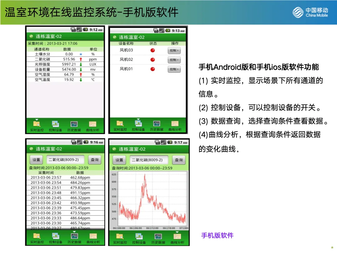 在智能温室中,部署在各处的传感器构成了一张无形的感知网络,7×24小时不间断采集数据。这些数据通过低功耗的无线网络实时传输至云端平台。管理者不仅可以通过电脑端的监控平台,以曲线图、三维动画等形式直观查看历史与实时数据,更能通过手机App,随时随地掌握温室状态,远程控制风机、遮阳、灌溉等设备的启停。