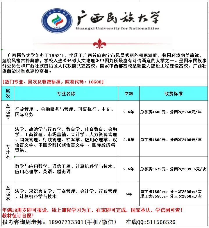 祥情请咨询周老师: 18907773301 (微信同号)广西民族大学2026年成人高考函授招生简章(附学位免考条件)