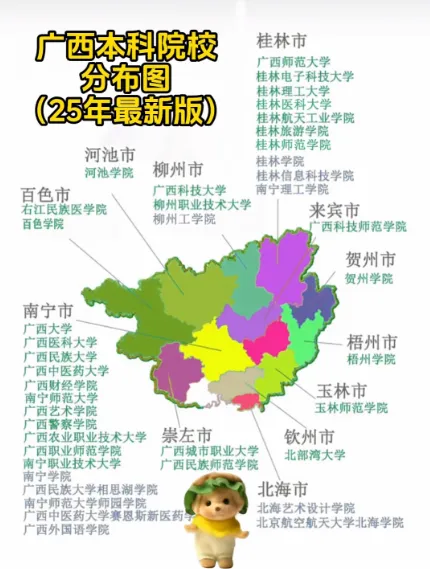 中国地质大学、广西开放大学、桂林电子科技大学、桂林理工大学、广西民族大学、广西科技大学、广西师范大学、南宁师范大学、广西中医药大学、广西医科大学、桂林医学院、广西警察学院、广西工程职业学院、广西安全工程职业技术学院、南宁理工学院、百色学院、贺州学院……数十所高校任君挑选。