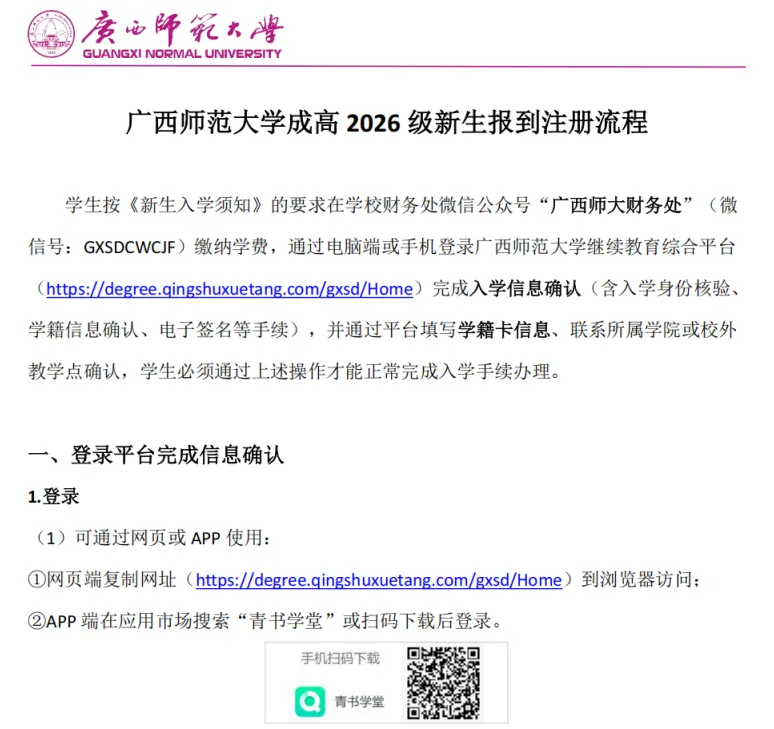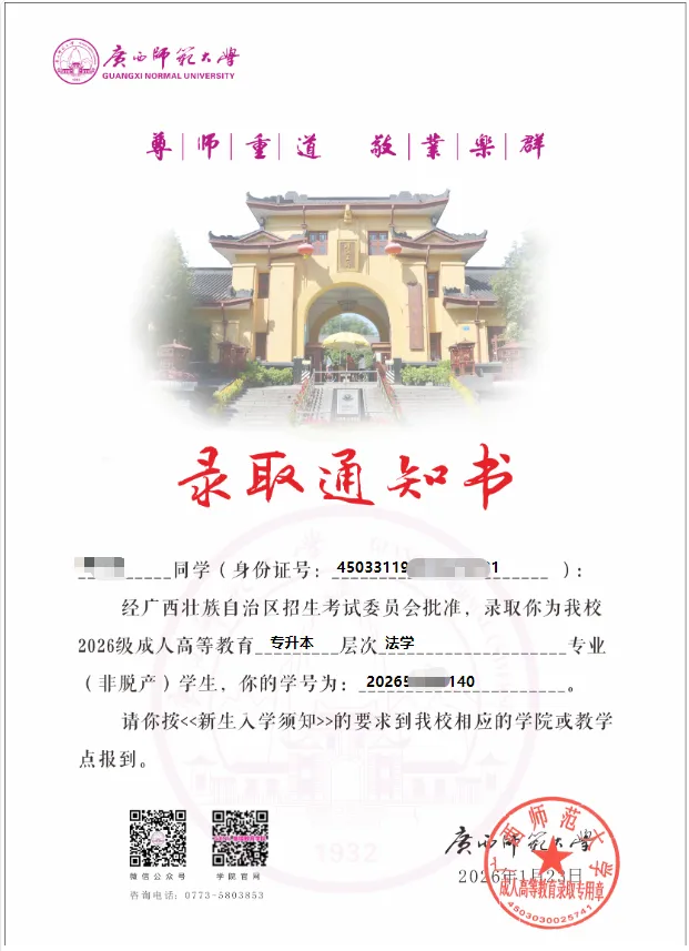 广西师范大学成高2026级录取通知书,下载网址: http://www.cjy.gxnu.edu.cn