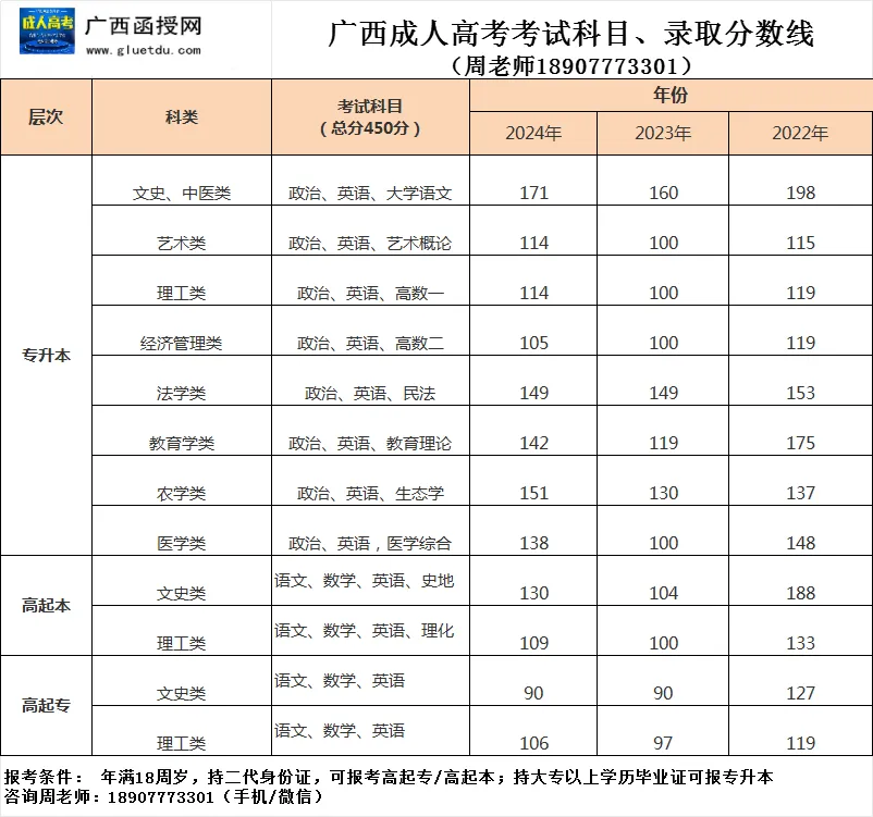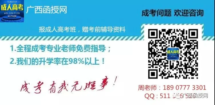 广西成人高考报考条件:1、高中起点专科: 凡年满18周岁,有身份证者,均可报考。2、专科起点本科:凡具备国民教育系列专科以上学历者,均可报考。