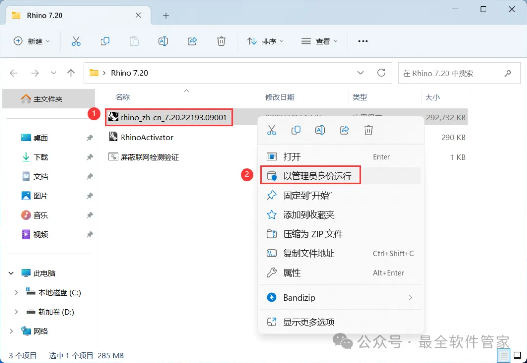 8、回到Rhino 7.20文件夹,找到【屏蔽联网检测验证】程序,右键选择【以管理员身份运行】它