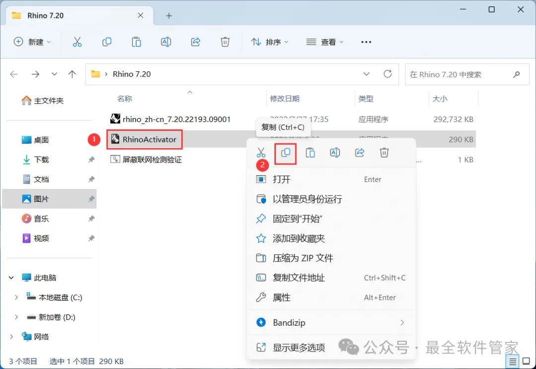 10、回到Rhino 7.20文件夹,找到【RhinoActivator】程序,再右键点击【复制按钮】