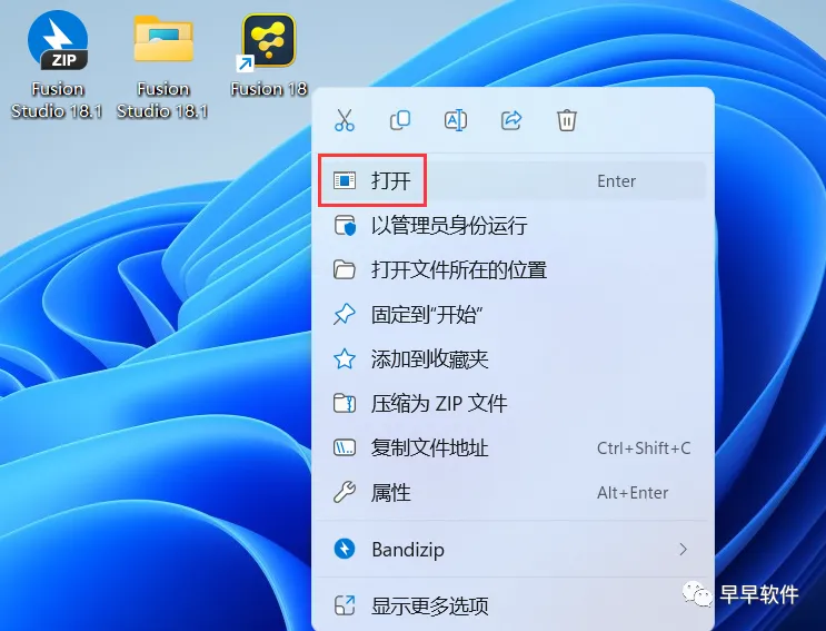 15、回到桌面,右键桌面上的【Fusion 18软件图标】,点击【打开】