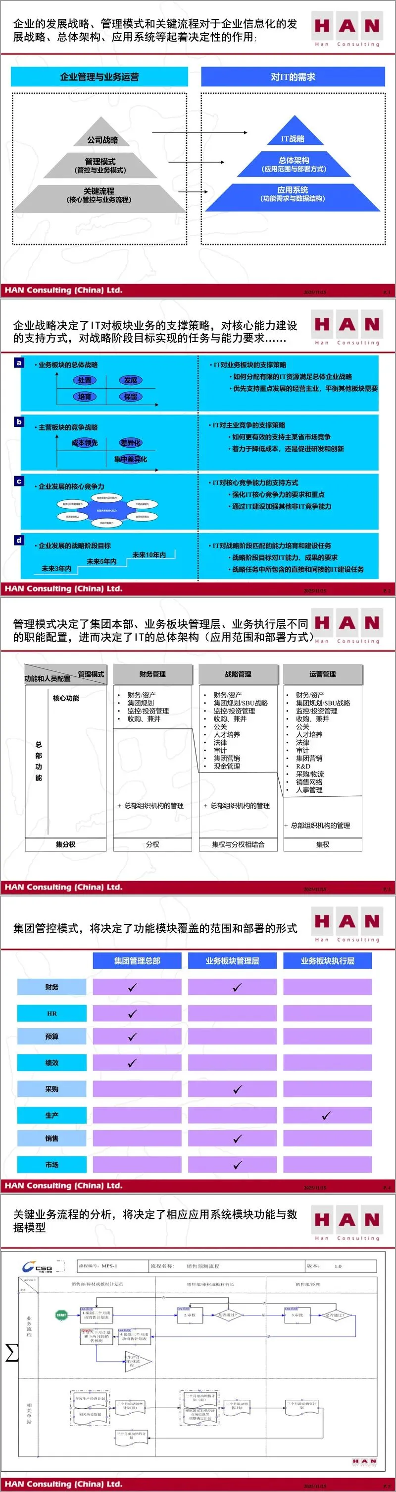 在客户企业理解与IT需求分析环节,材料强调必须深入把握企业发展战略、管理模式与关键业务流程。企业战略决定了IT对业务板块的支撑策略、对核心能力的支持方式以及对战略阶段目标的匹配任务。具体而言,业务板块的总体战略(处置、发展、保留、培育)直接影响IT资源的分配策略;主营板块的竞争战略(成本领先、差异化、集中差异化)决定了IT是着力于降低成本还是促进创新;企业核心竞争力则明确了IT强化的重点方向;战略阶段目标则提出了IT能力建设的时序要求。