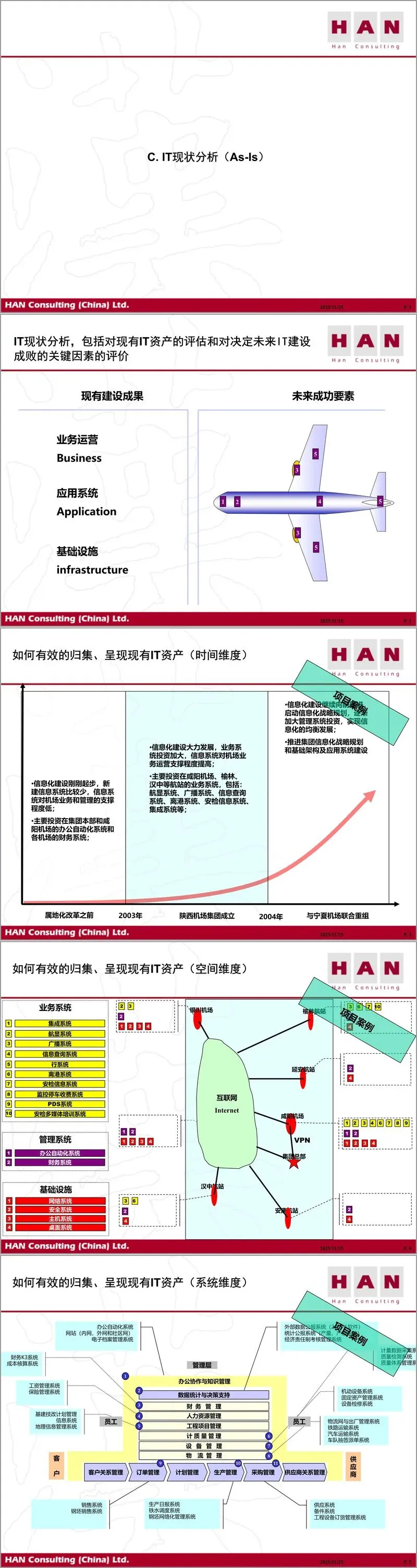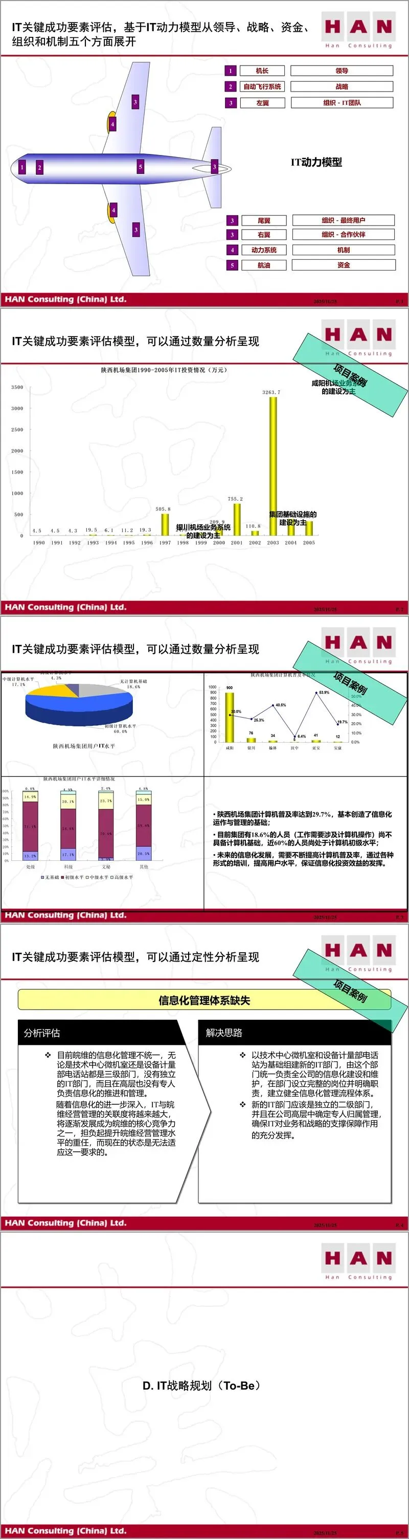 在IT现状分析部分,材料提出应从时间、空间、系统三个维度有效归集现有IT资产,并基于IT动力模型从领导、战略、资金、组织与机制五个方面评估IT关键成功要素。通过陕西机场集团的案例,说明了计算机普及率与用户技能水平对信息化效益发挥的重要影响。