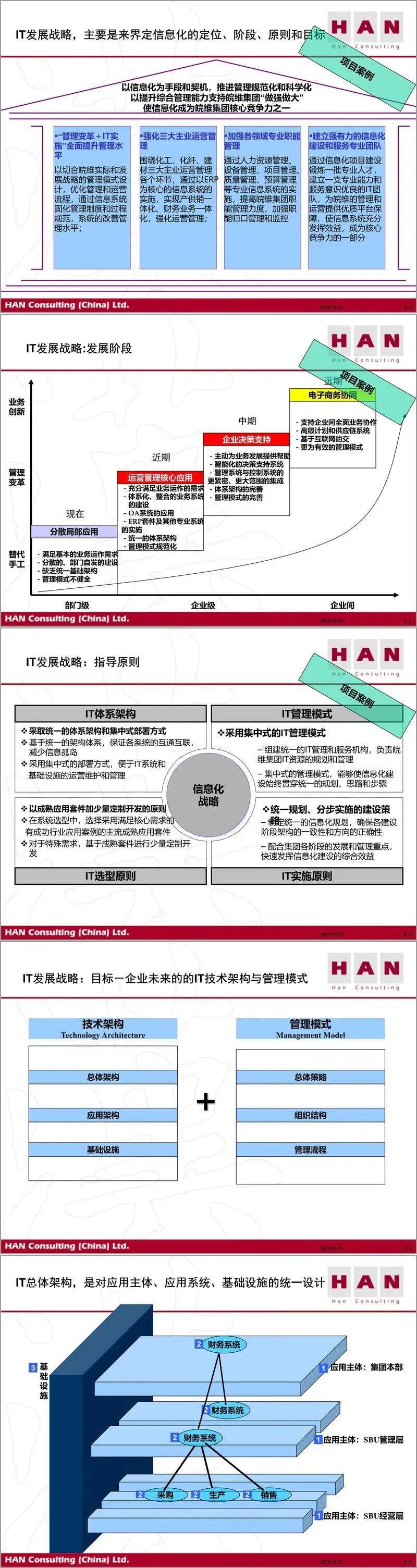 IT战略规划部分明确了信息化发展的阶段、原则与目标。材料提出应采取统一架构与集中部署,选择成熟套件加少量定制开发,坚持统一规划分步实施。IT总体架构涵盖应用主体、应用系统与基础设施的统一设计,而IT管理模式则明确了集中化管理的优势,包括资源整合、规范统一与运维高效。