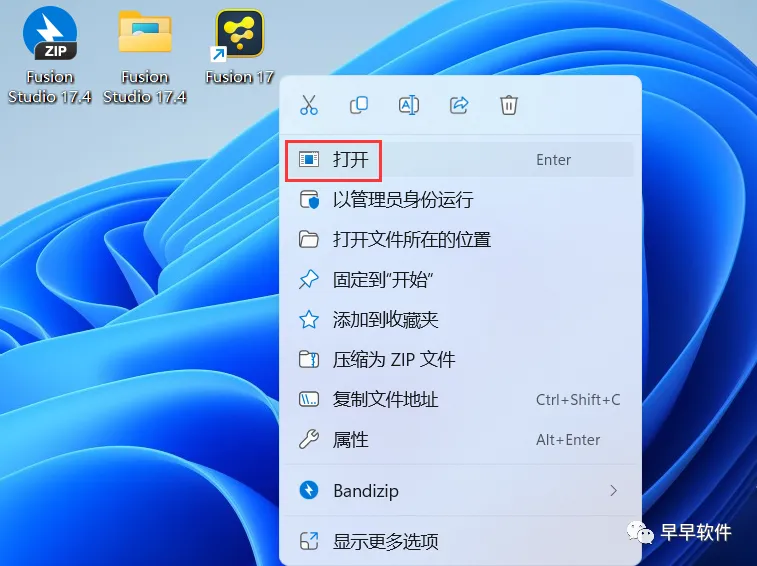 15、回到桌面,右键桌面上的【Fusion 17软件图标】,点击【打开】