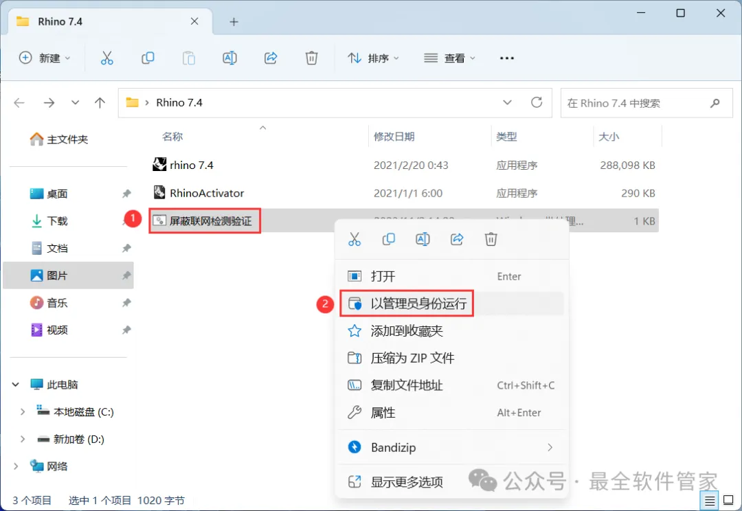 8、回到Rhino 7.4文件夹,找到【屏蔽联网检测验证】程序,右键选择【以管理员身份运行】它