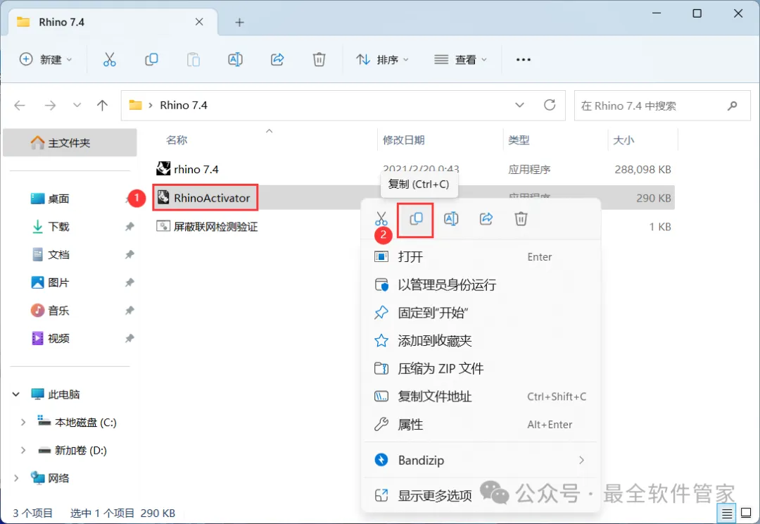 10、回到Rhino 7.4文件夹,找到【RhinoActivator】程序,再右键点击【复制按钮】