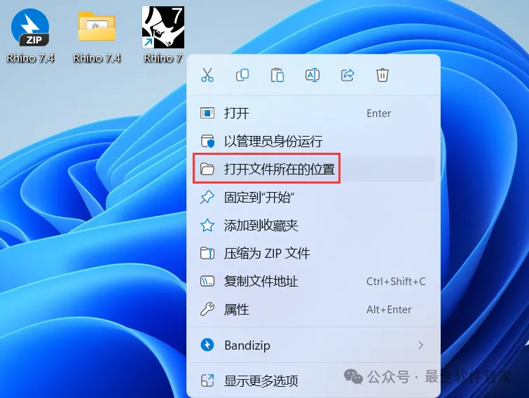 11、回到桌面,右键桌面上的【Rhino 7软件图标】,点击【打开文件所在的位置】