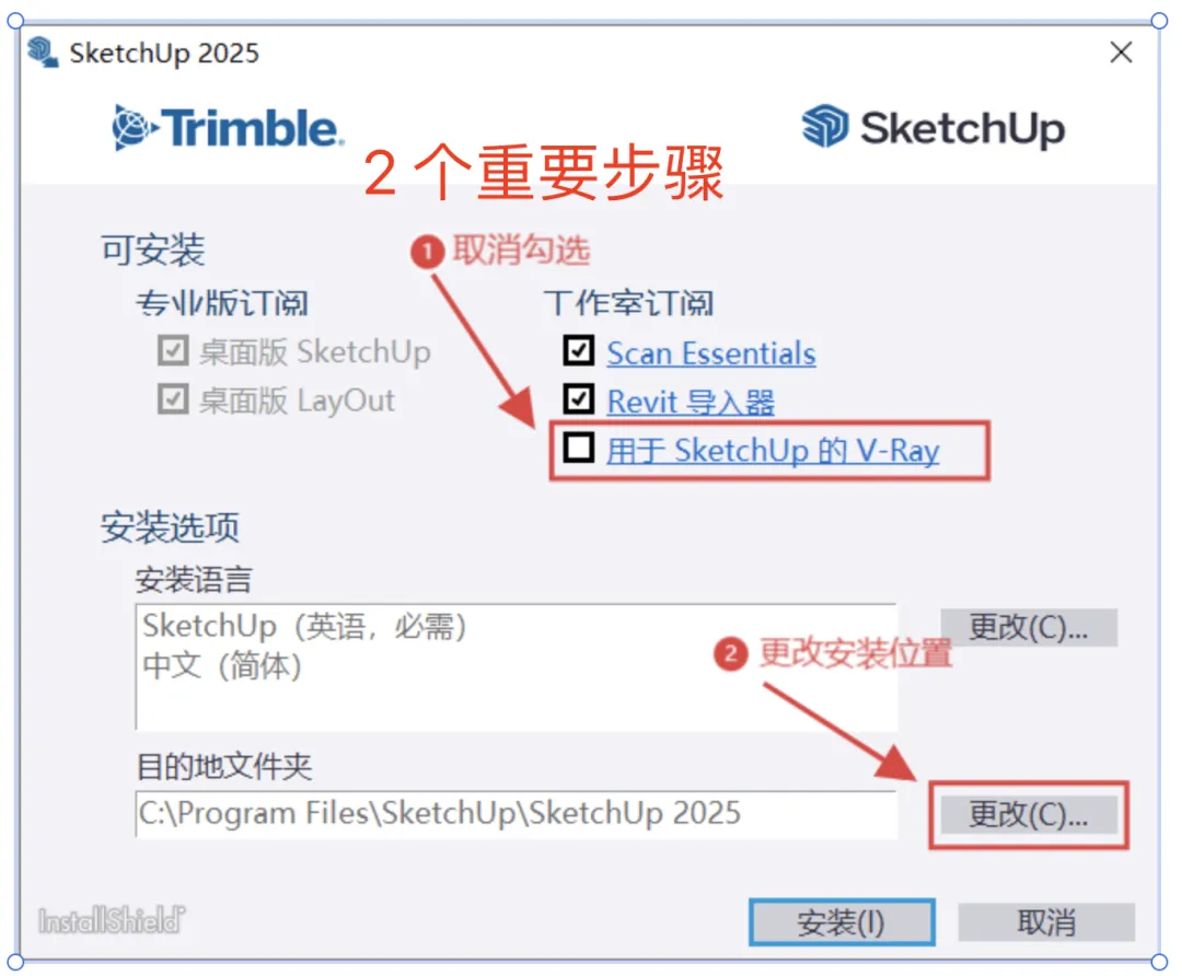 在安装选项界面,取消勾选:用于SketchUp的 V-Ray,