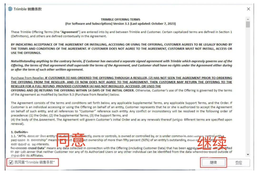 双击桌面图标启动SketchUp 2025。在许可协议界面,勾选:我同意...,然后点击继续。