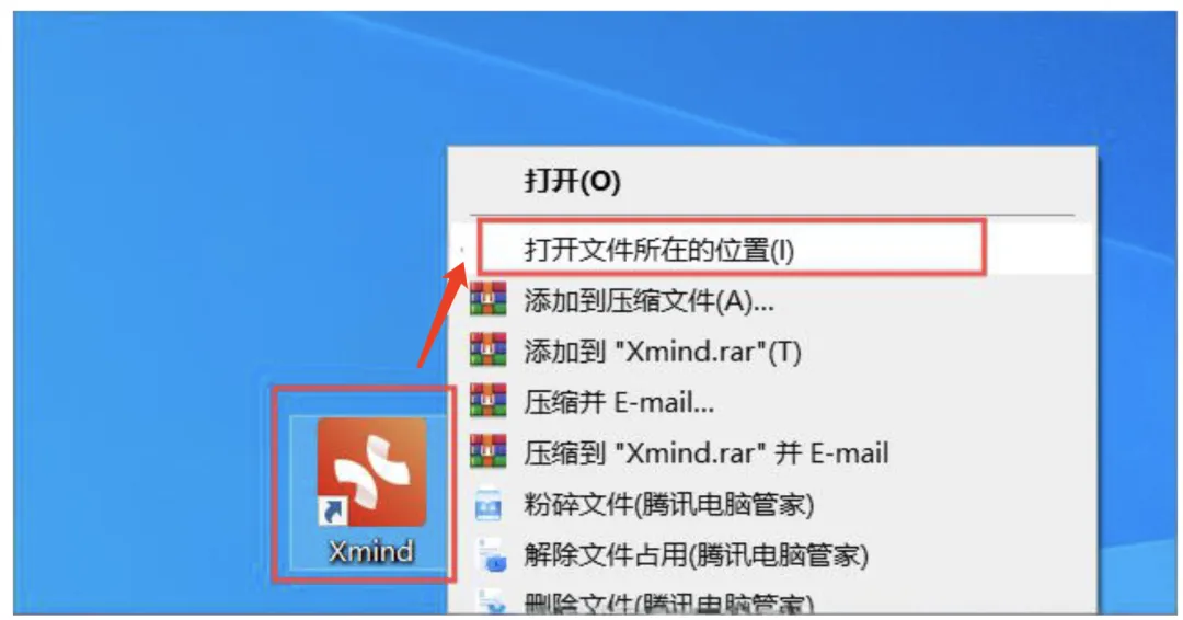 6、在桌面找到:Xmind图标,右键点击:打开文件所在位置。