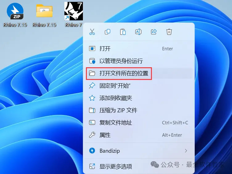 11、回到桌面,右键桌面上的【Rhino 7软件图标】,点击【打开文件所在的位置】