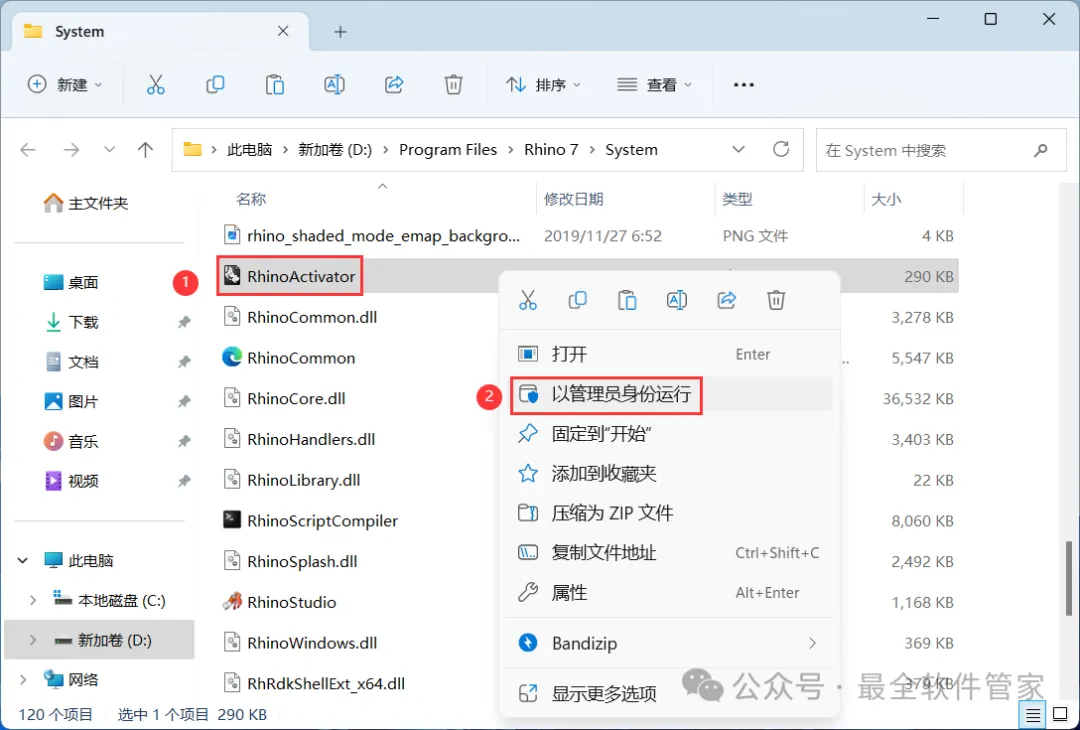 13、找到粘贴的【RhinoActivator】程序,再右键选择【以管理员身份运行】它