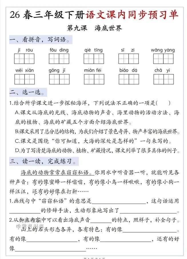 今天给大家整理了26春三年级下册语文第三单元寒假预习单,转发给朋友或班级群,受益更多人,帮助孩子学习!