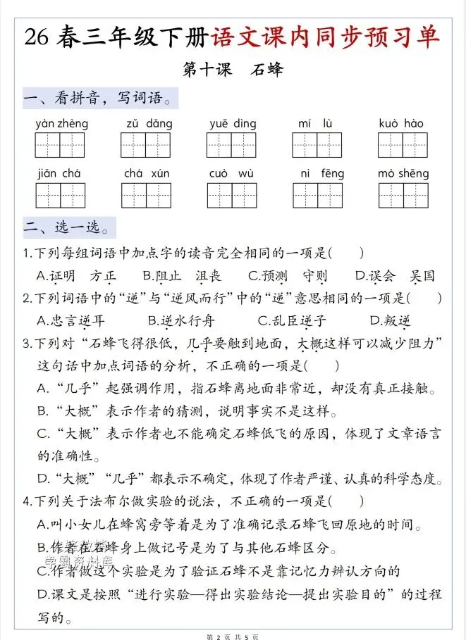 文末免费下载|26春三年级下册语文第三单元寒假预习单