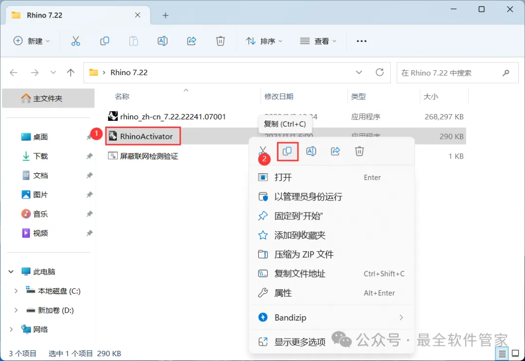 10、回到Rhino 7.22文件夹,找到【RhinoActivator】程序,再右键点击【复制按钮】