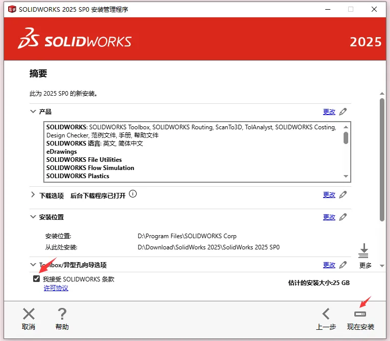19.勾选我接受SOLIDWORKS条款,点“现在安装”