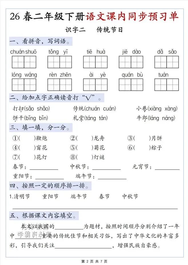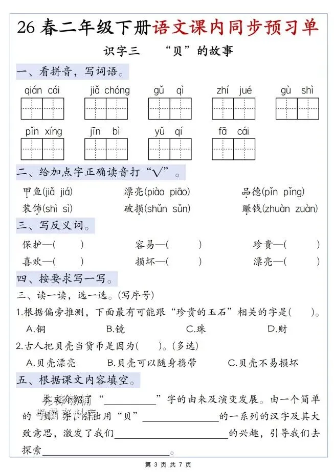 今天给大家整理了26春二年级下册语文第三单元寒假预习单,转发给朋友或班级群,受益更多人,帮助孩子学习!