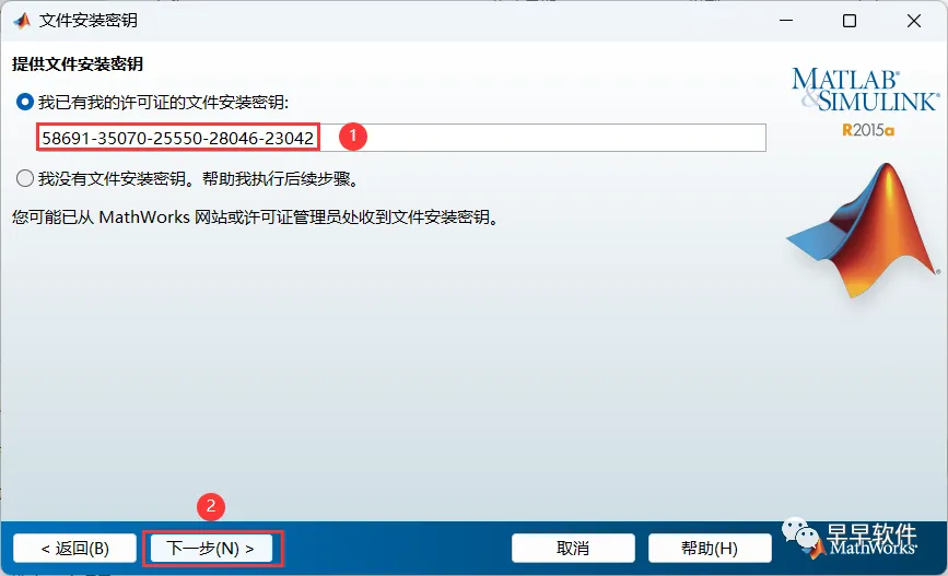 7、输入安装密钥:58691-35070-25550-2 8046-23042,再点击【下一步】