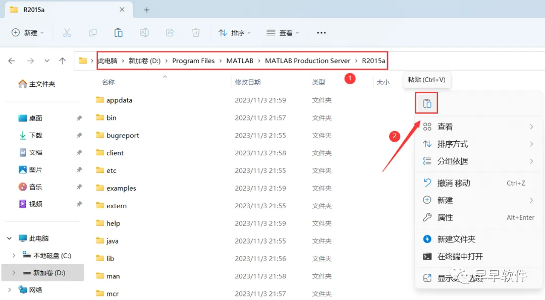 16、打开路径:D:\Program Files\MATLAB\ MATLAB Production Server\R2015a,再右键文件夹的空白处,点击【粘贴按钮】