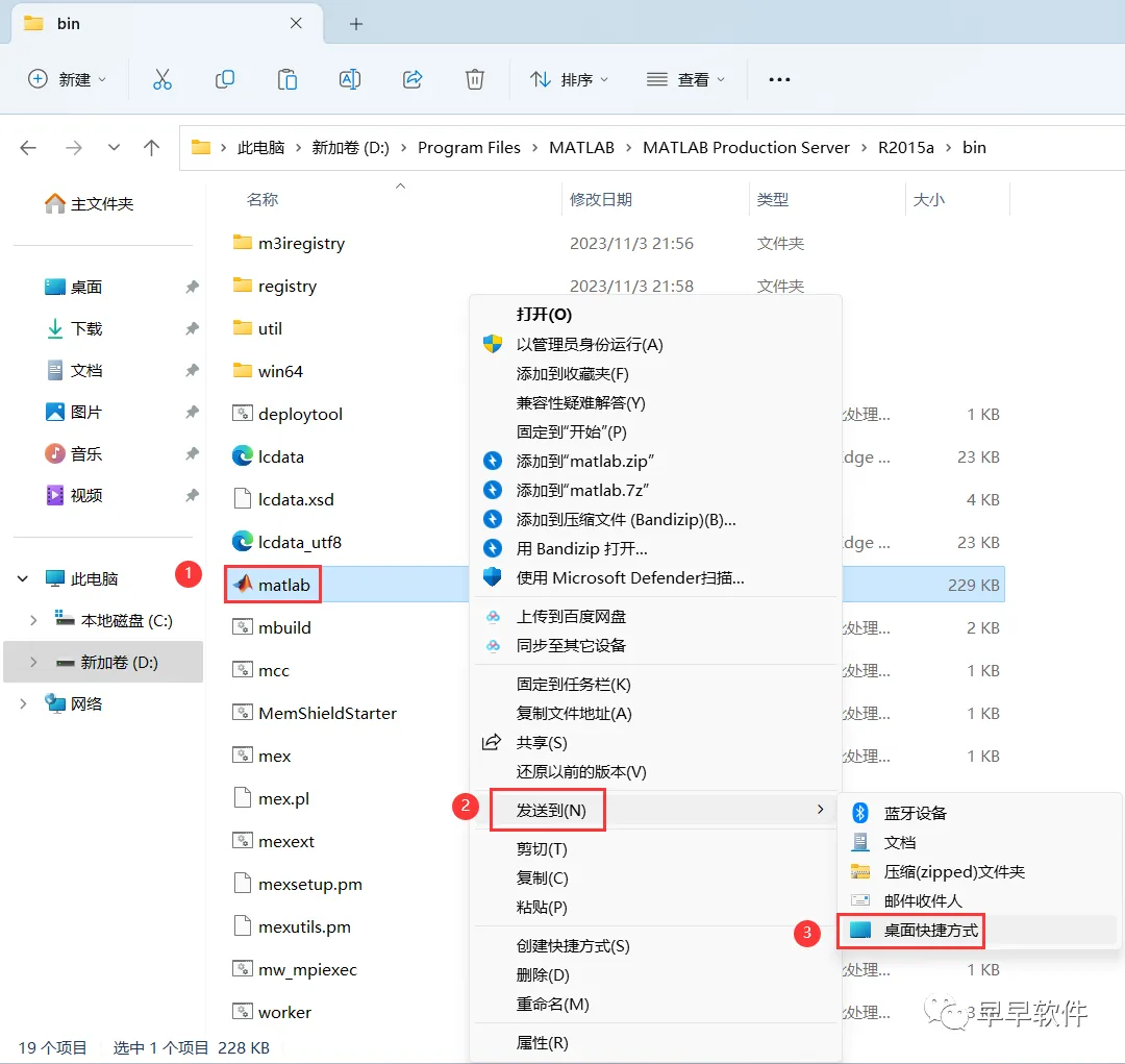19、找到【matlab】程序,右键依次点击【显示更多选项】、【发送到】、【桌面快捷方式】,完成软件桌面快捷方式的创建