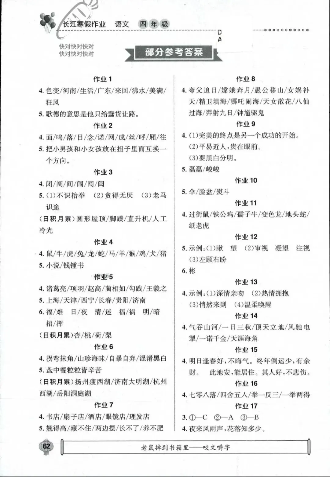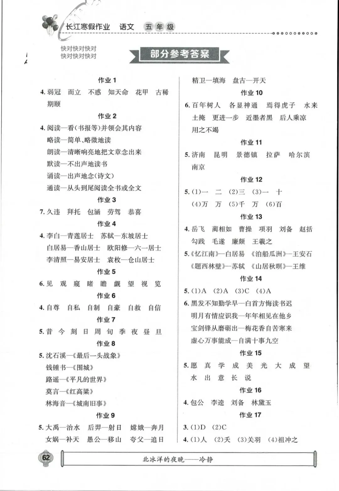 寒假的大门已经欣然开启,马年寒假,与文字温暖相约!各学校也相继布置了寒假作业,融学科作业与素养作业为一体让孩子们度过充实的假期,其中学科类武汉市通版的寒假作业为《长江寒假作业》&《开心假期寒假作业》两本,有的孩子也早早完成了,小编为大家收集到了参考答案,大家写完后可以及时核对一下哦~