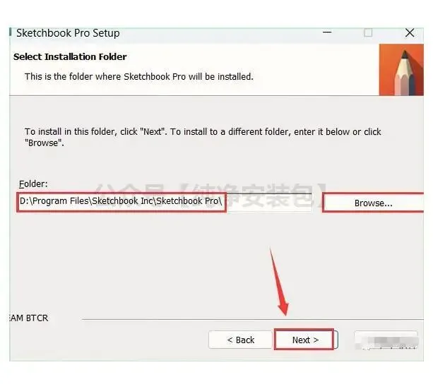Sketchbook 2022下载安装教程 - 5. 这一步需要选择软件安装位置。系统默认会将软件安装在C盘,但如果你的C盘空间有限,可以自定义更改安装路径。这里我选择安装在D盘,选好后点击【Next】继续