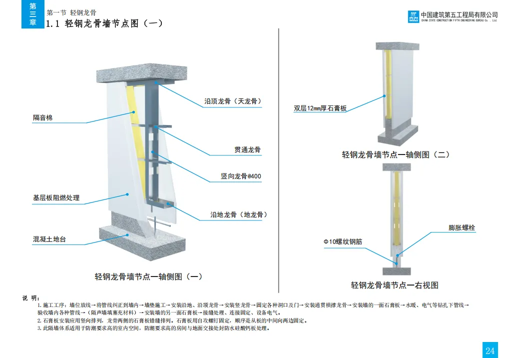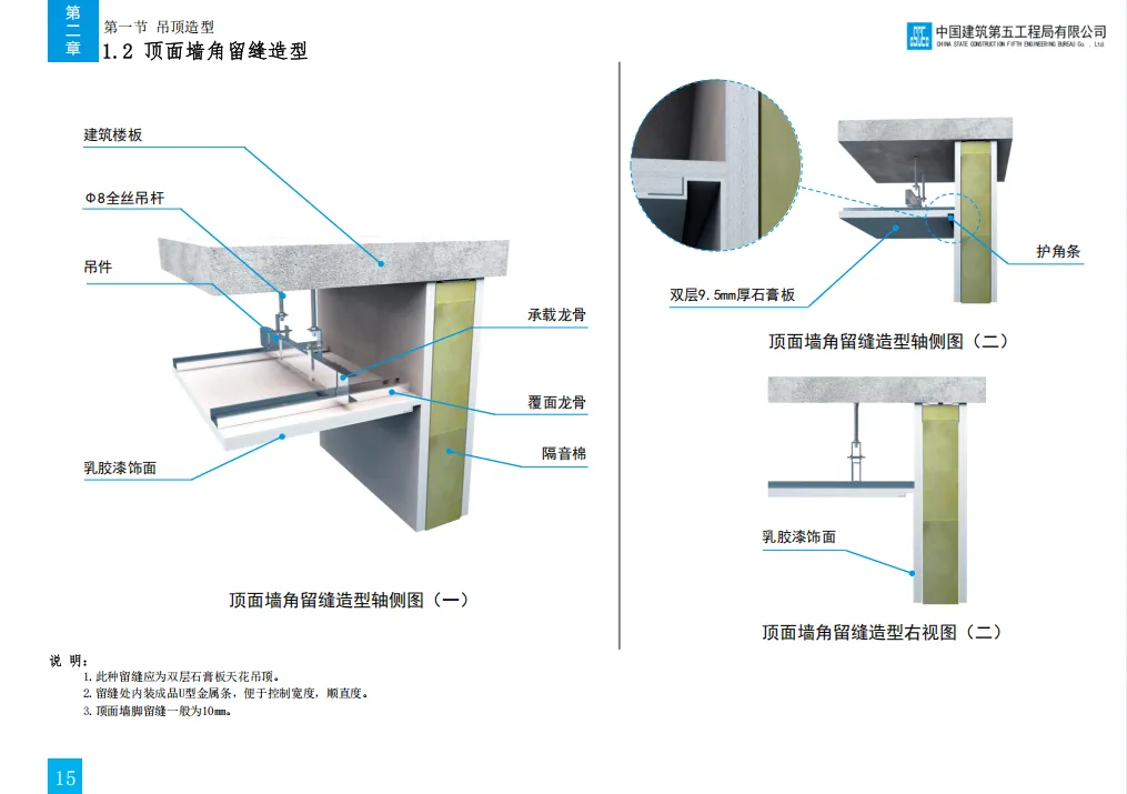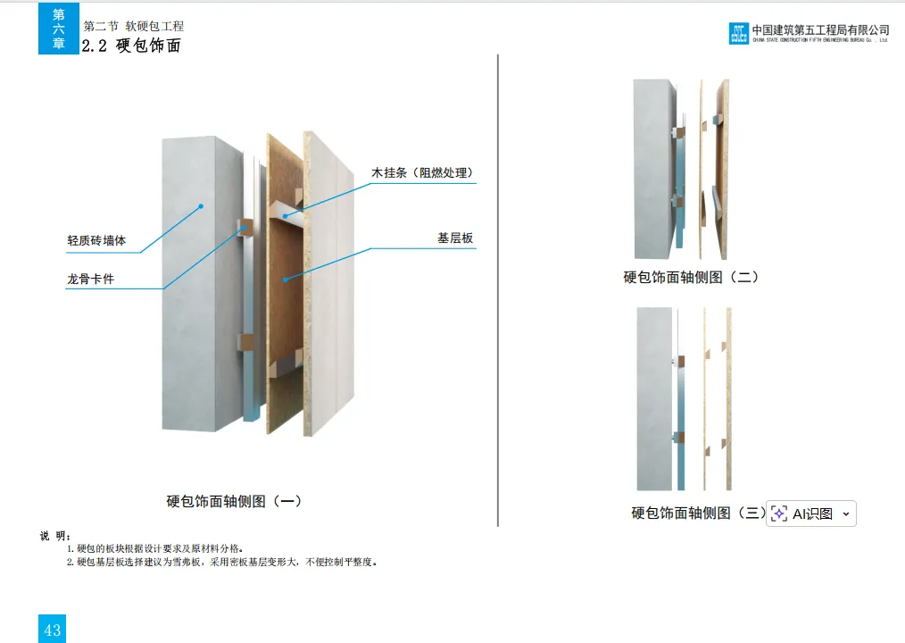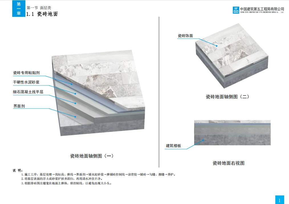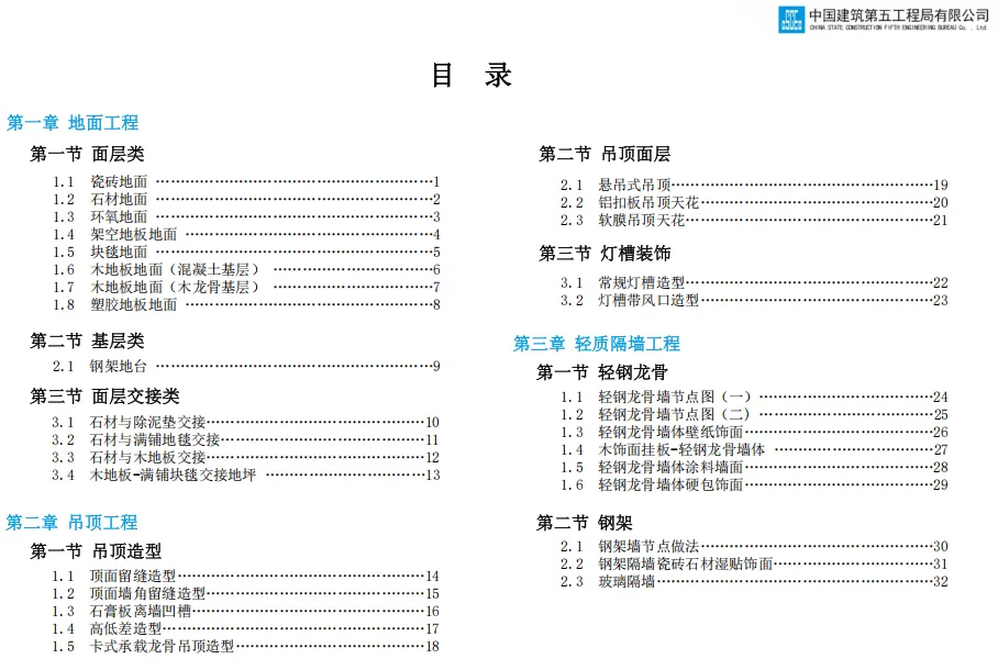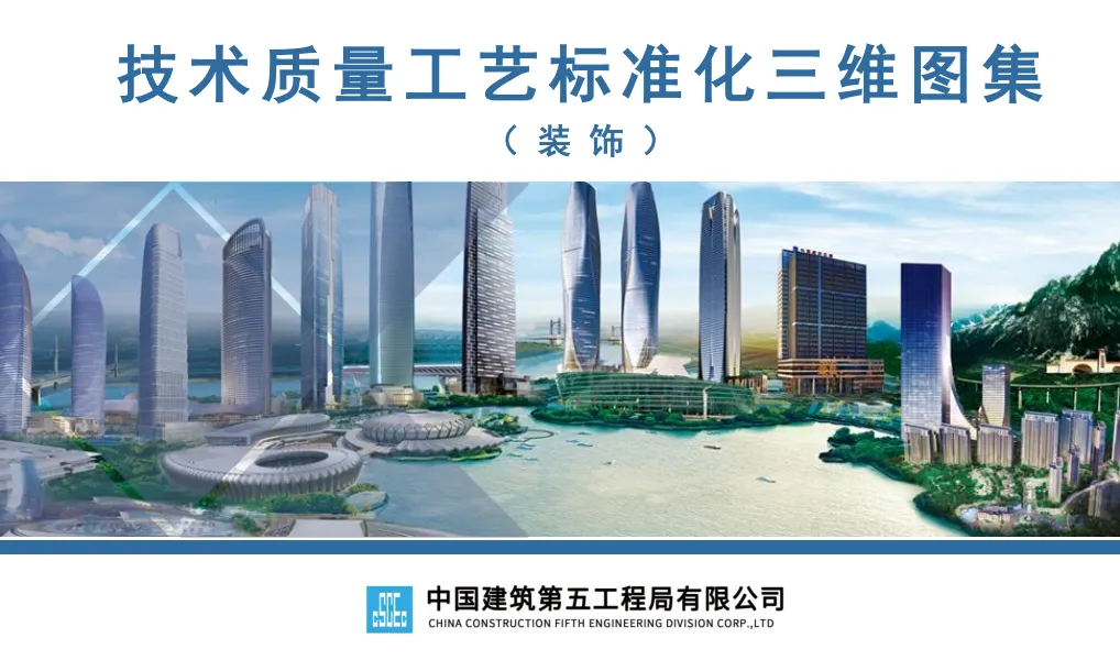 此前我们分享了中建七局的精装修三维图集,其标准化工艺和模块化施工给大家留下了深刻印象。今天,我们将焦点转向同为中建体系内的标杆企业 —— 中建五局。《中建五局技术质量工艺标准化三维图集 (装饰)》是中建五局 2020 年发布的装饰工程专业手册,以国家规范和企业管理要求为依据,聚焦地面、吊顶、轻质隔墙等七大核心工程,通过三维模型直观呈现 63 项关键工序的标准工艺做法、施工工序、节点构造及质量控制点,涵盖瓷砖地面、轻钢龙骨隔墙、软膜吊顶等常见装饰场景,同时明确材料选型、尺寸要求(单位默认 mm)及防潮、防火等专项措施,是装饰工程施工策划、方案编制及技术交底的实操性指南。