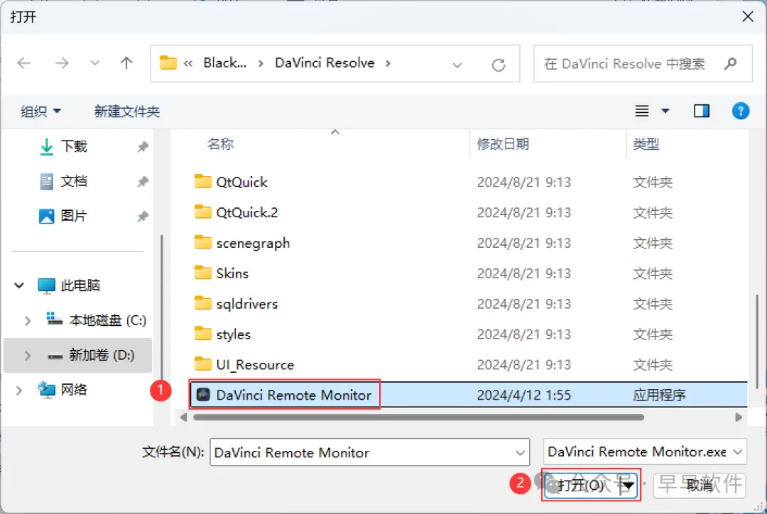 24、找到并选中【DaVinci Remote Monitor】文件,再点击【打开】