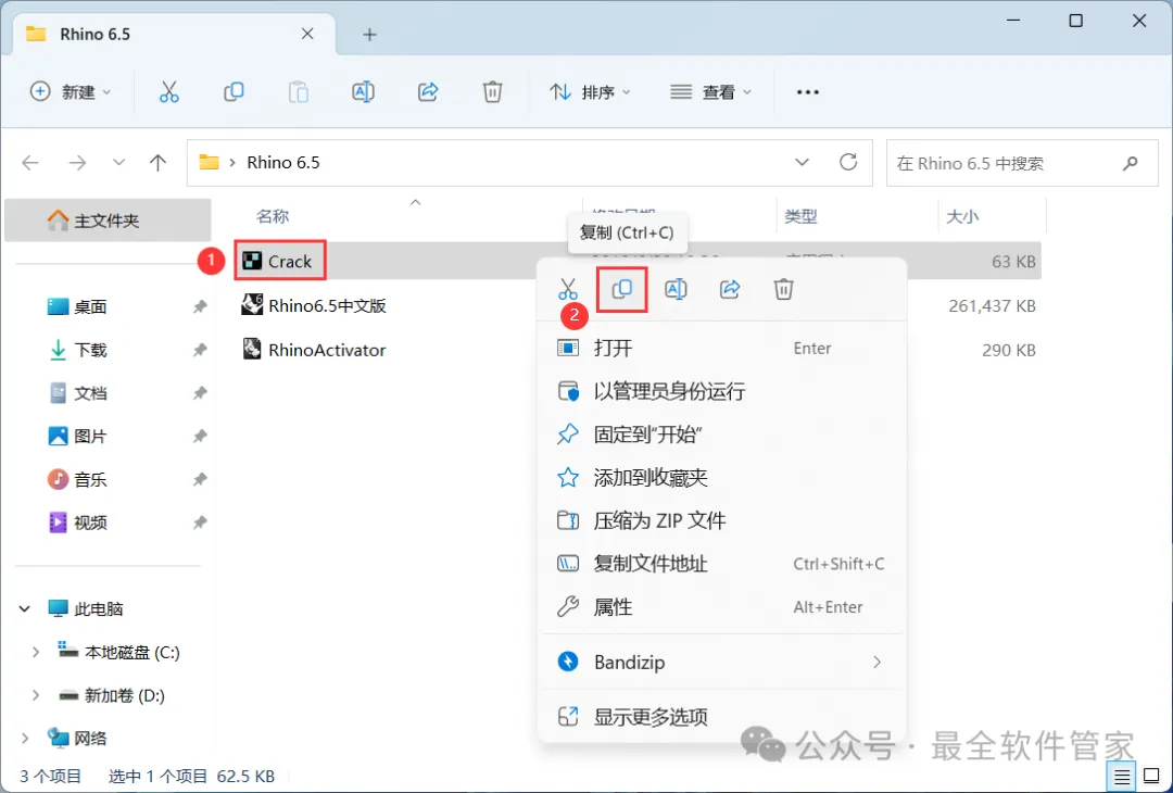 8、回到Rhino 6.5文件夹,找到【Crack】程序,再右键点击【复制按钮】