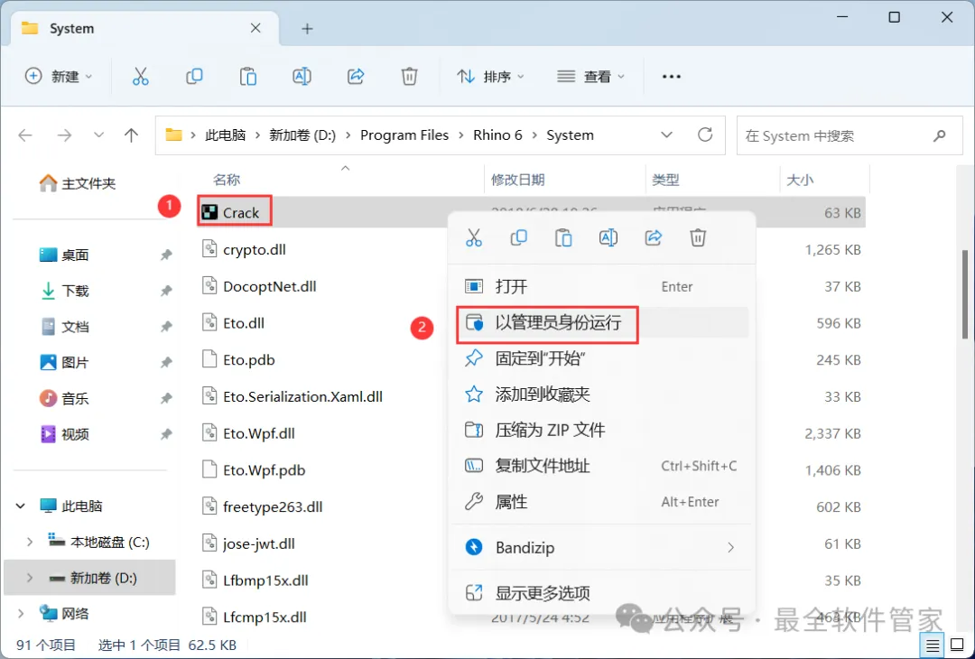 11、找到粘贴的【Crack】程序,再右键选择【以管理员身份运行】它
