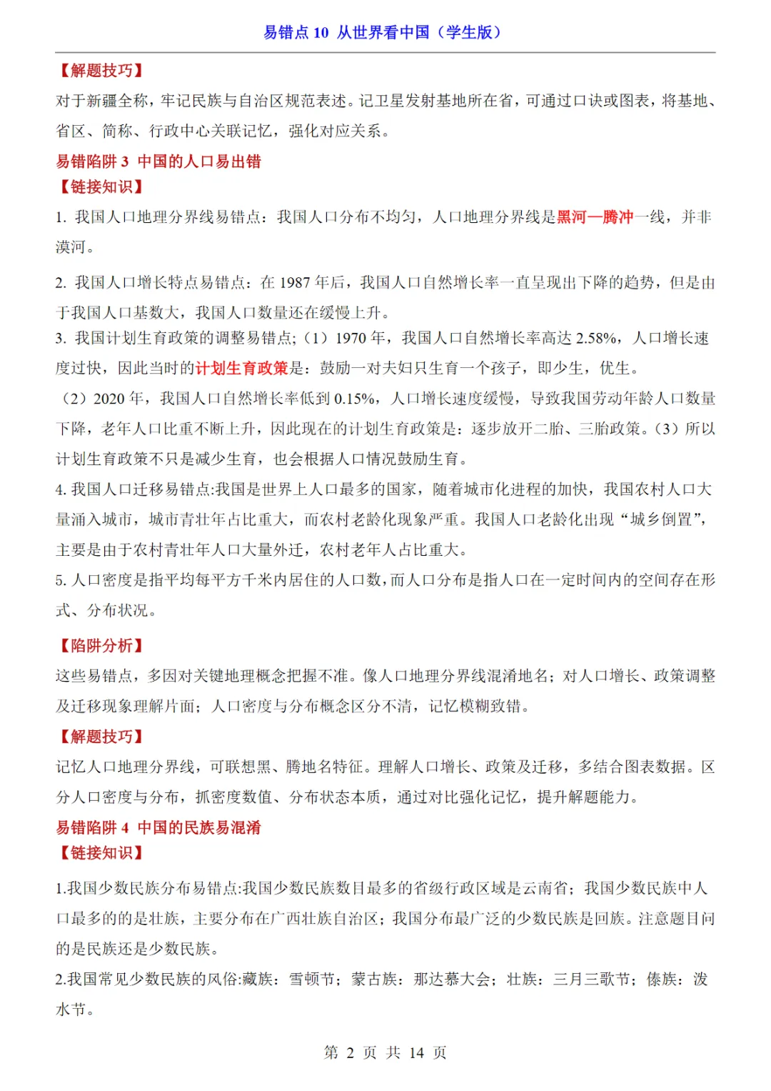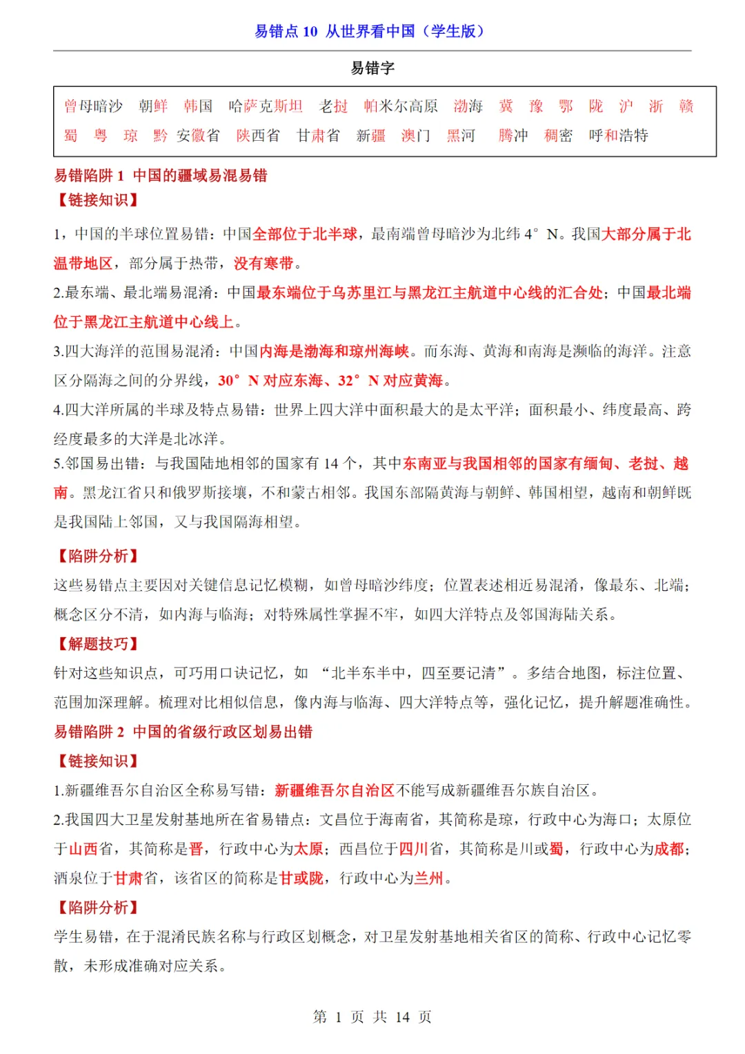 【免费下载】会考专项地理易错点10 从世界看中国,PDF电子版,可打印