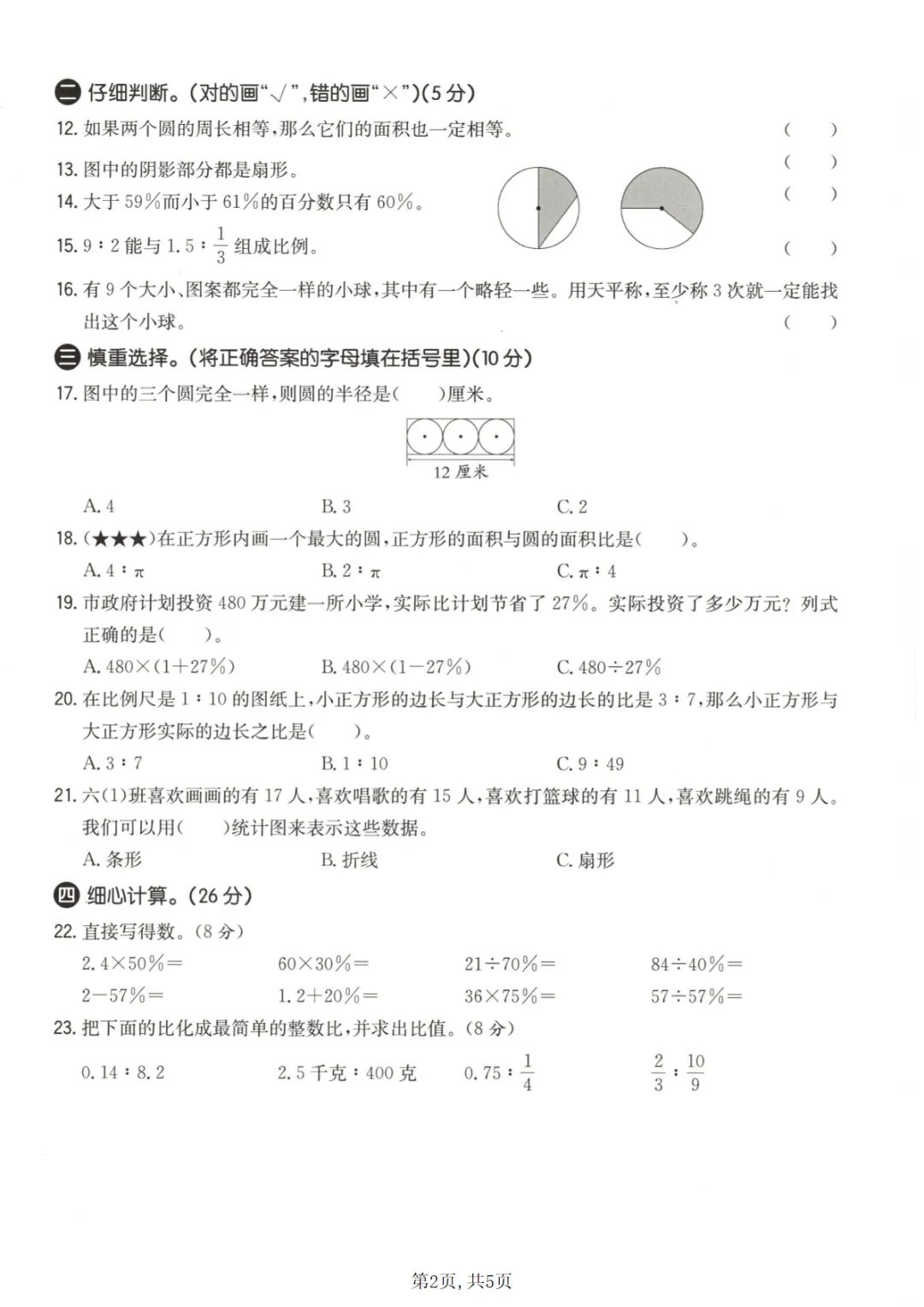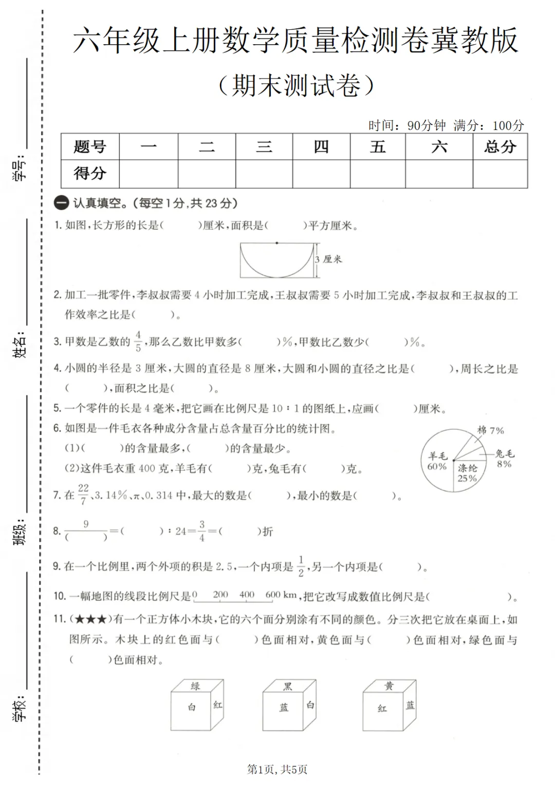 >【免费下载】六上冀教版数学【期末测试卷4】,PDF电子版,可打印