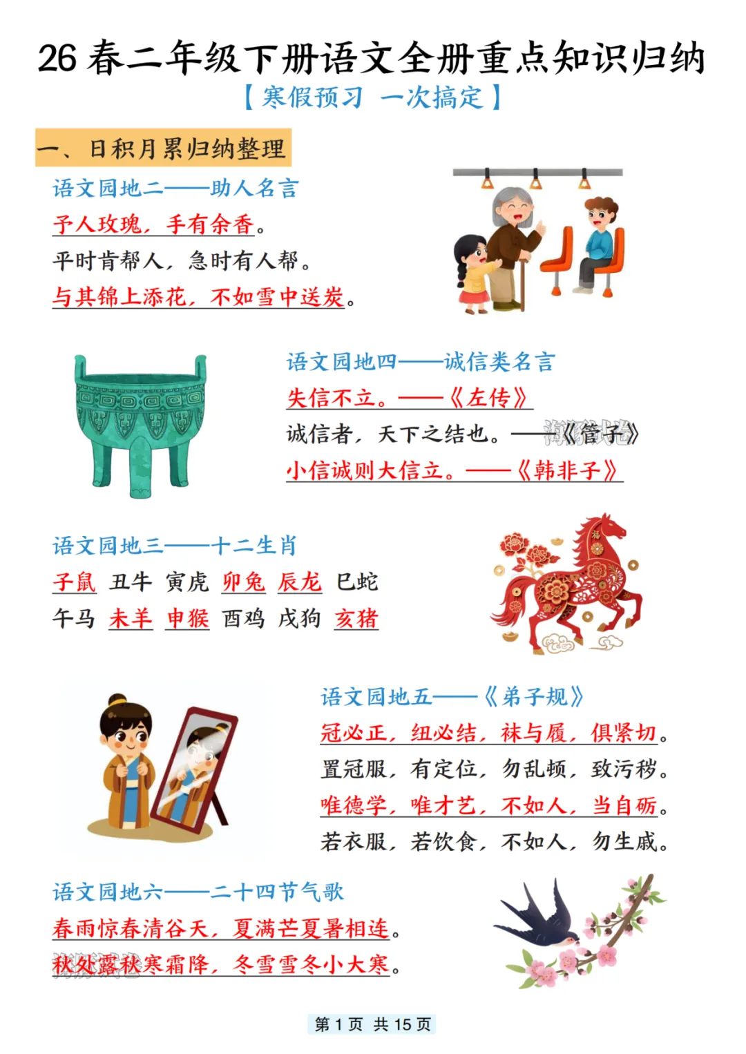 今日分享《2026年新人教版二年级下册语文寒假预习(全册重点知识汇总)》电子版!共15页,电子版可打印可下载,这份二下语文重点知识点汇总,包含了必背古诗、词语积累、字音字形、日积月累、课文说明的道理等内容,利用寒假的时间让孩子预习一下,帮助孩子提前熟悉下新学期的重点知识,减轻开学后的学习压力。需要的家长抓紧打印出来,让孩子背一背吧。
