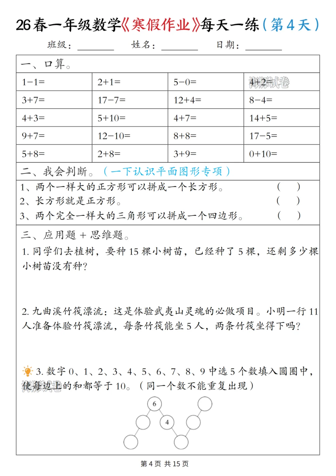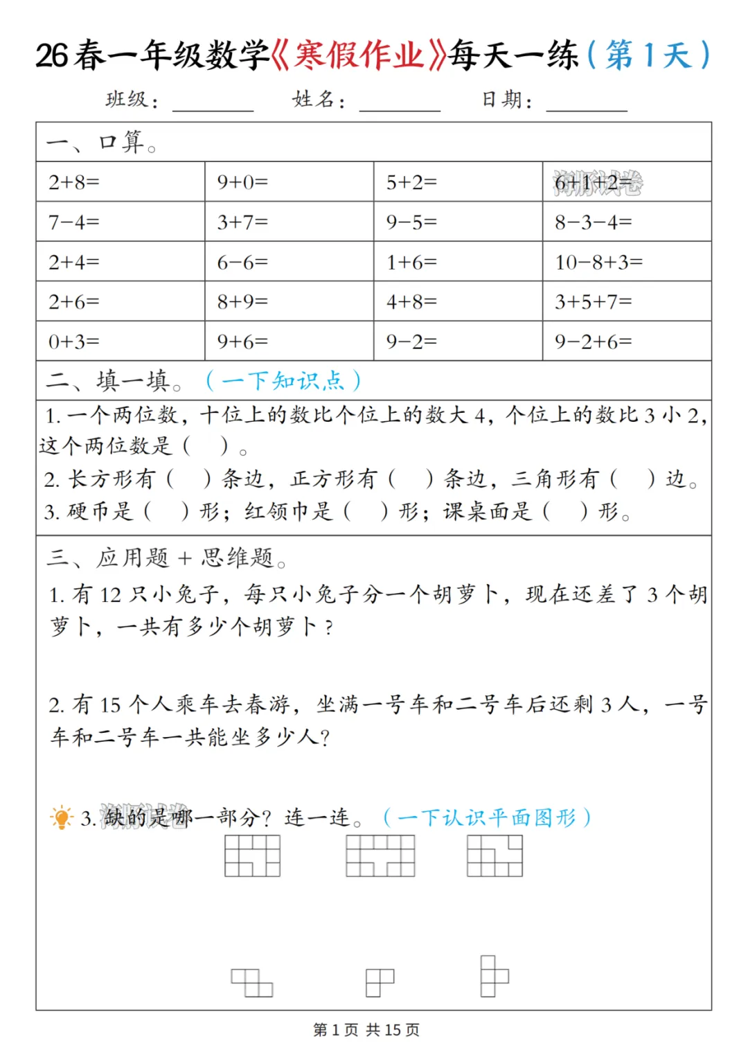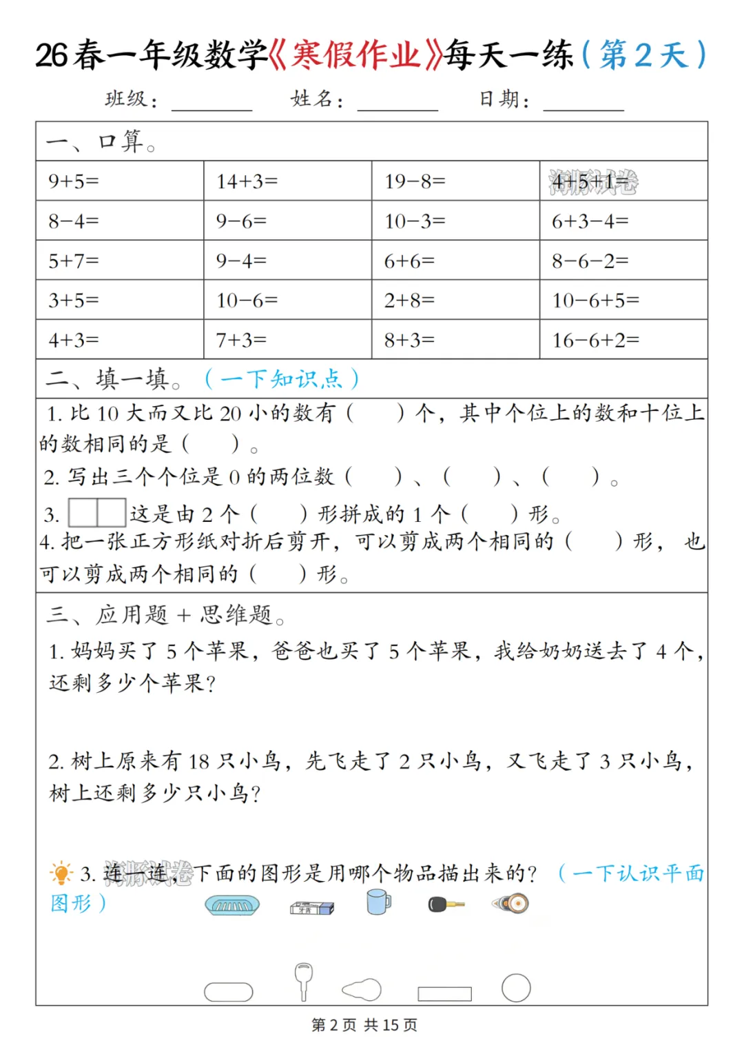 今日分享《2026春一年级数学寒假作业每日一练(一天一页)》电子版!各位家长看过来!这套一年级数学《寒假作业》每日一练,用30天的科学规划,帮孩子在假期巩固计算、看图列式等核心能力。每天15分钟,从基础口算到思维拓展,题型贴合课本重点,还融入易错点训练,既能夯实基础,又能提升逻辑思维。