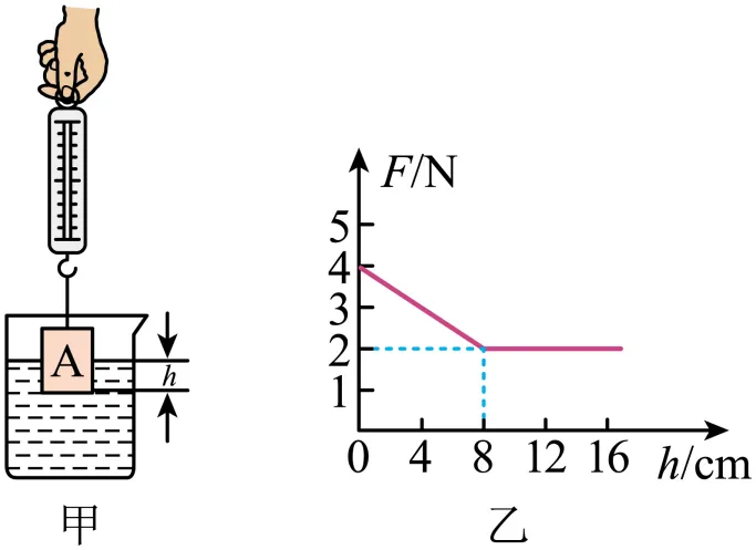 8. 小华用如图甲所示进行实验“探究影响浮力大小的因素”,A是实心圆柱体,根据数据作出的弹簧测力计示数F与物体浸入水中的深度h的关系图像如图乙,从图乙可知( )