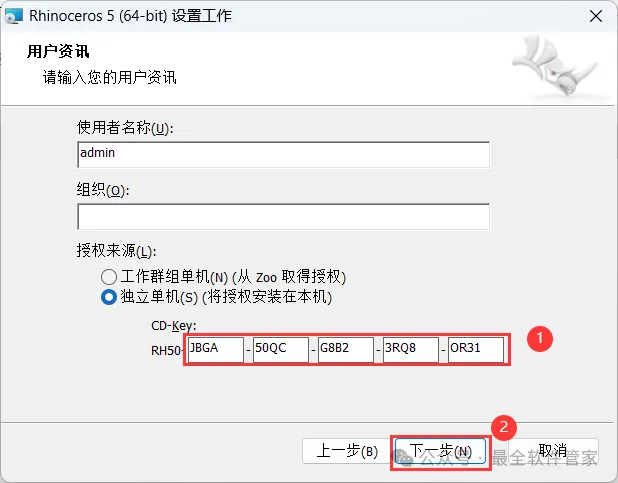 6、CD-Key输入:JBGA-50QC-G8B2-3RQ8-QR31,再点击【下一步】