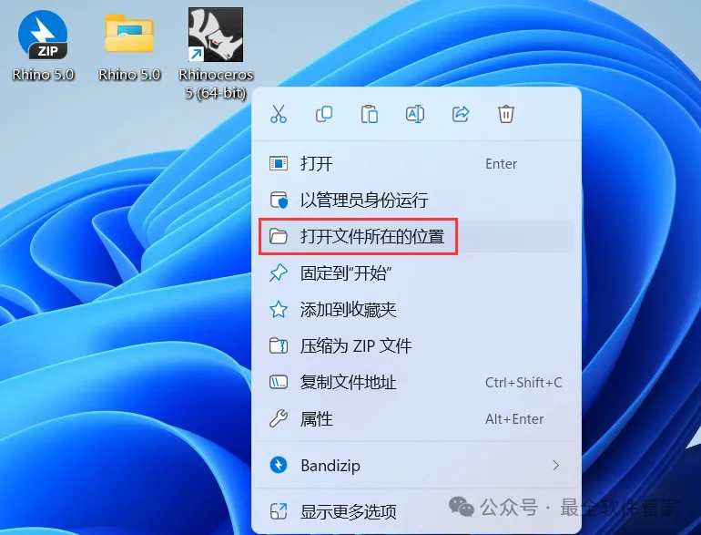 12、回到桌面,右键桌面上的【Rhino 5软件图标】,点击【打开文件所在的位置】