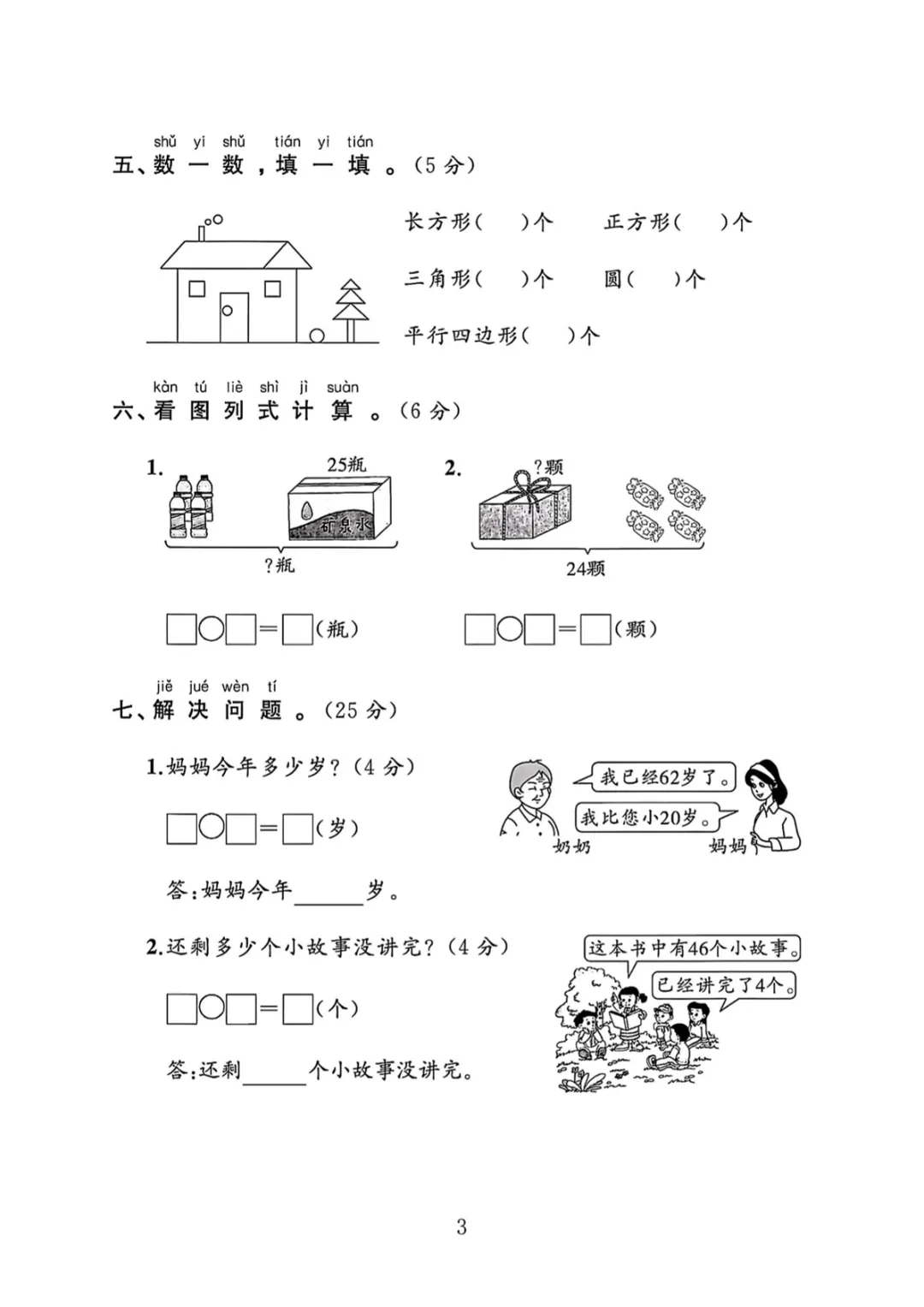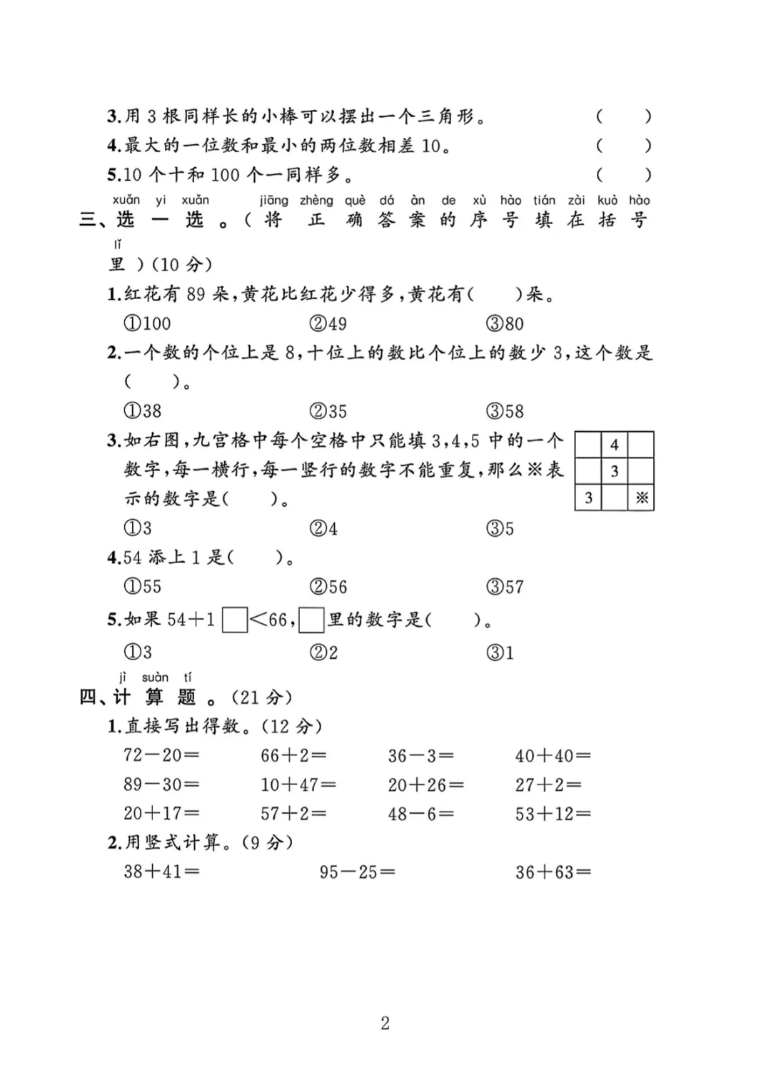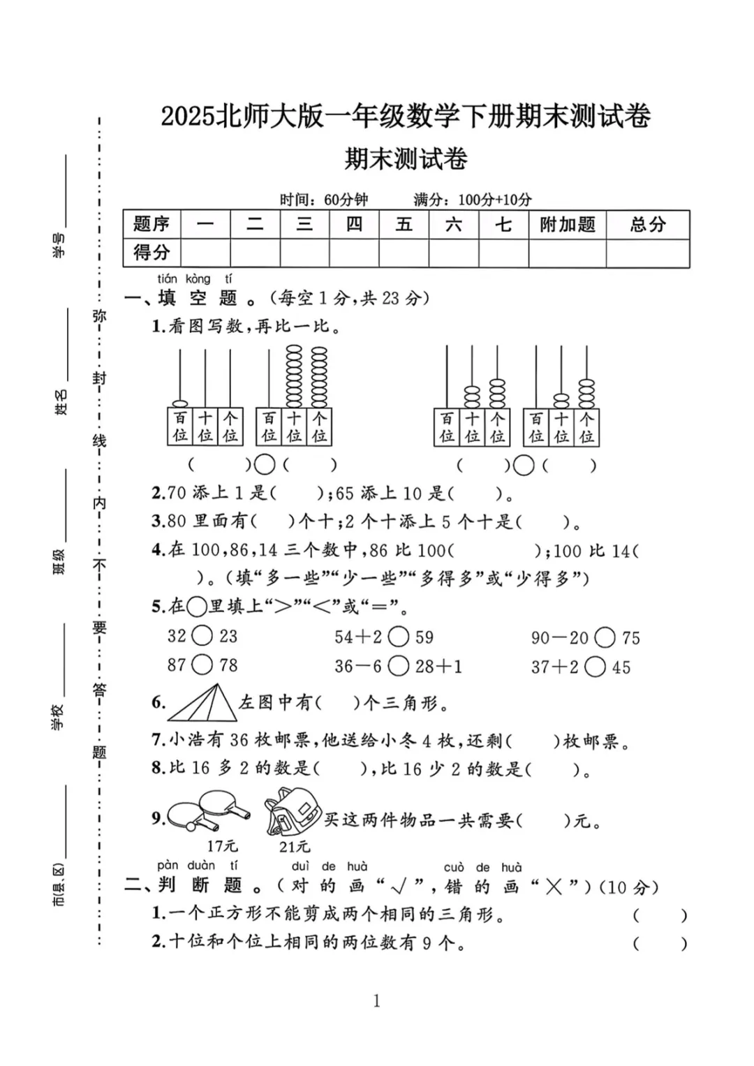 【免费下载】一年级(下)数学 期末测试卷《北师大版》