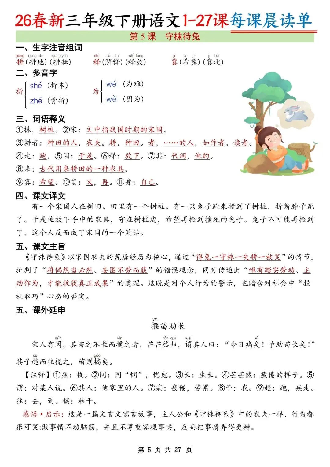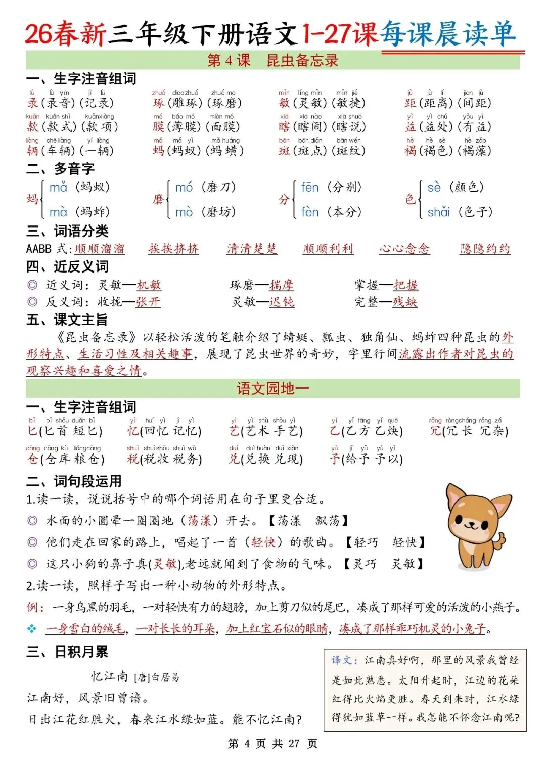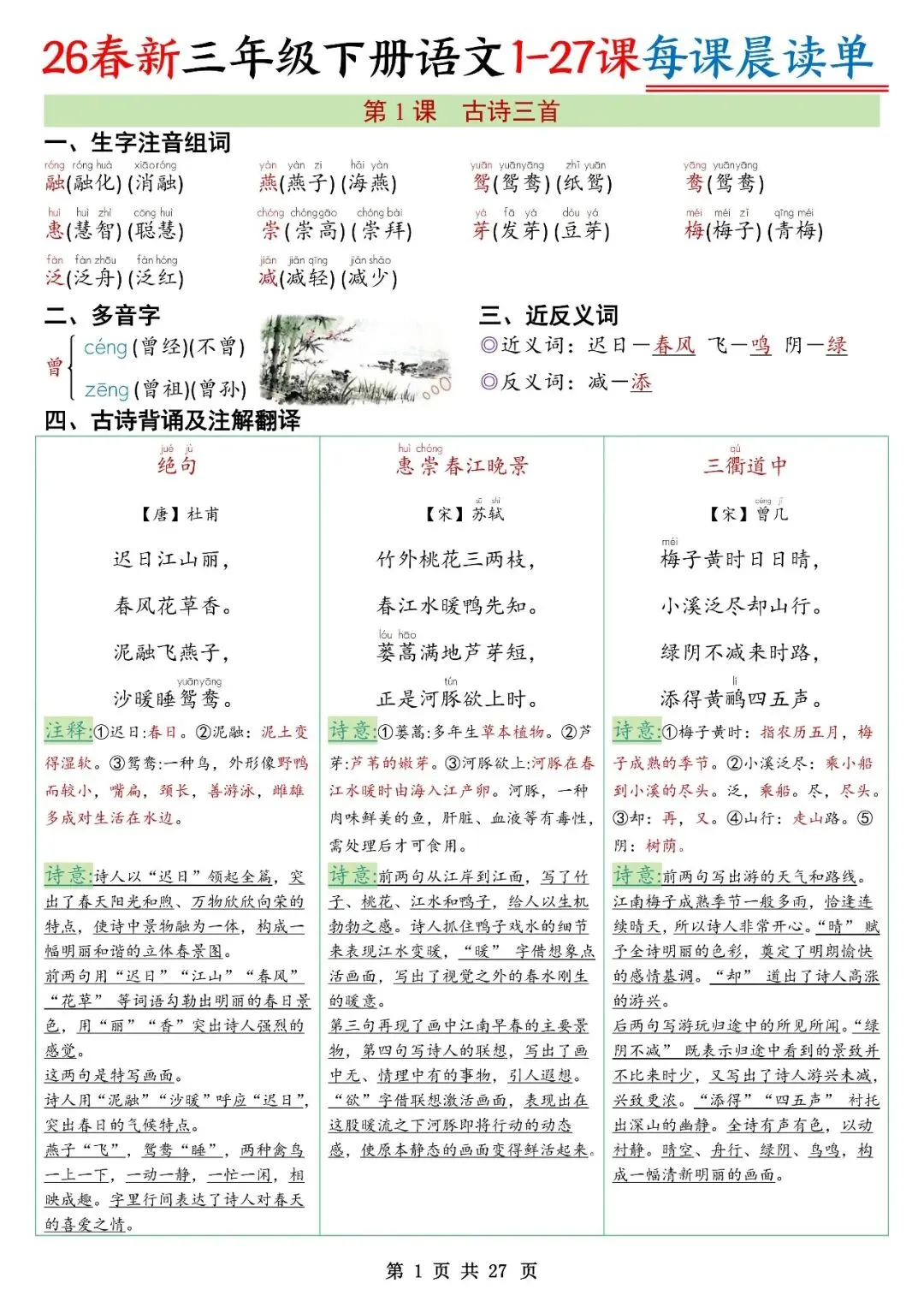 26春三下语文寒假预习每课晨读单,家长可免费下载打印出来,帮助孩子学习,完整高清电子版,下载方式见文末。