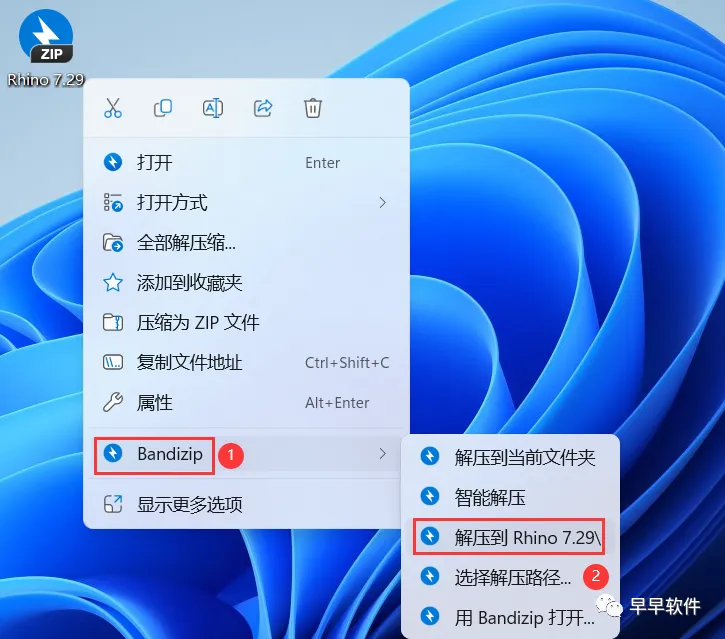 1、下载Rhino 7.29软件安装包到电脑上,右键选择【解压到Rhino 7.29\】
