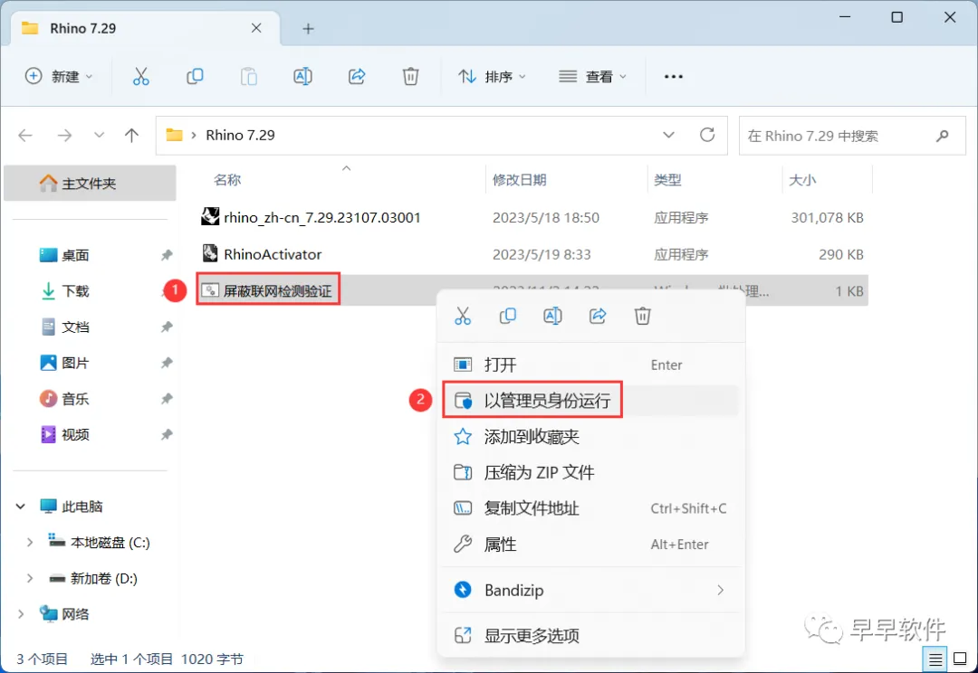 8、回到Rhino 7.29文件夹,找到【屏蔽联网检测验证】程序,右键选择【以管理员身份运行】它