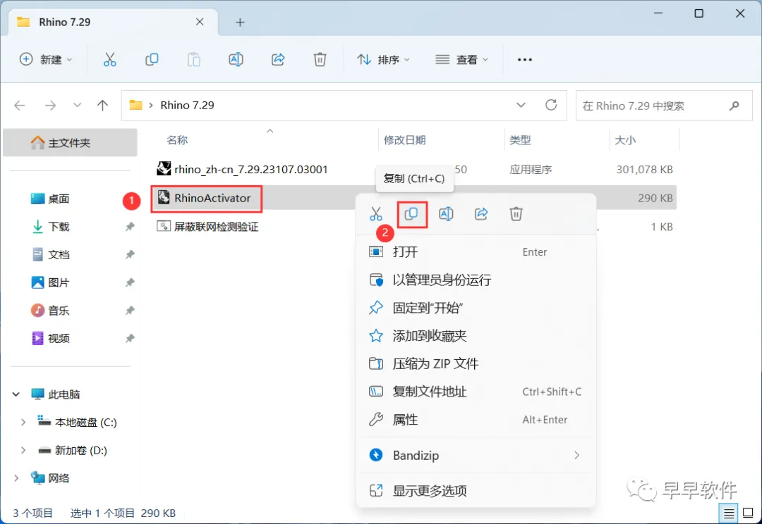10、回到Rhino 7.29文件夹,找到【RhinoActivator】程序,再右键点击【复制按钮】