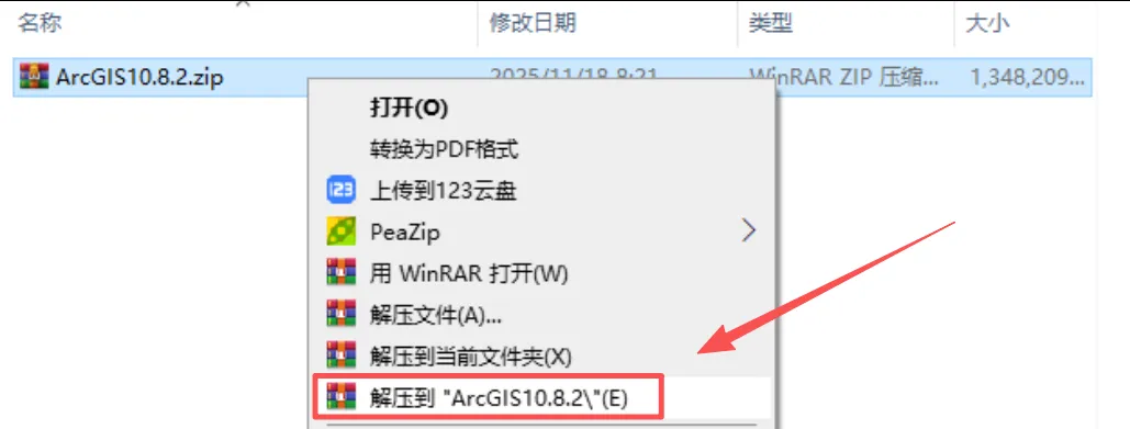 1,打开下载好的文件夹,找到压缩包【ArcGIS10.8.2.zip】,鼠标右键选择【解压到 ArcGIS10.8.2.zip】。