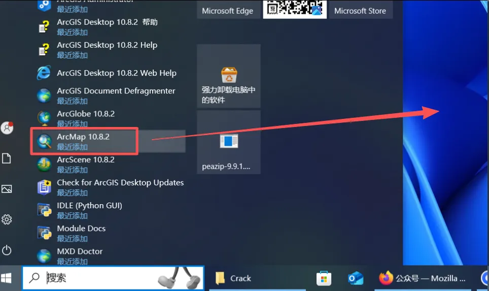 20, 在开始菜单中找到"ArcMap 10.8.2"软件,拖出桌面创建快捷方式。