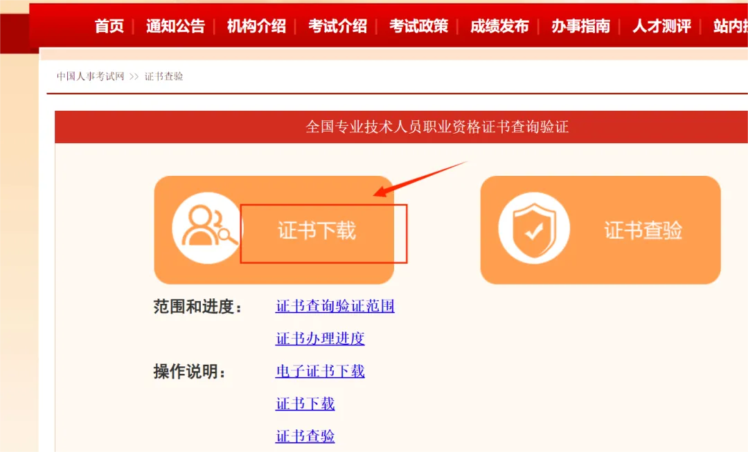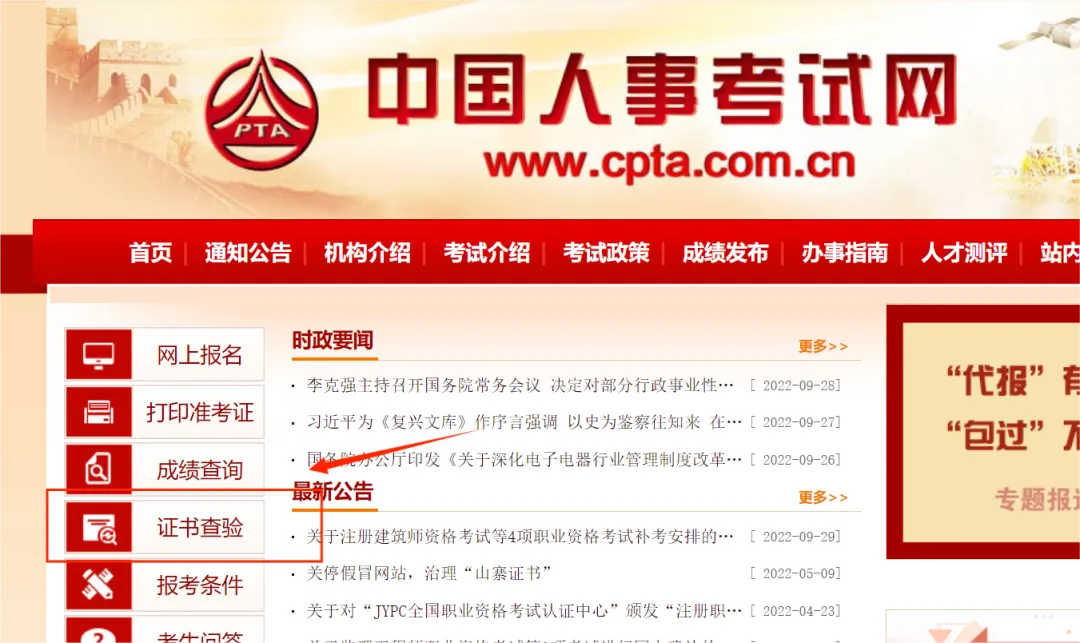 1.登录中国人事考试网(www.cpta.com.cn)首页,点击左侧菜单中的“证书查验”。