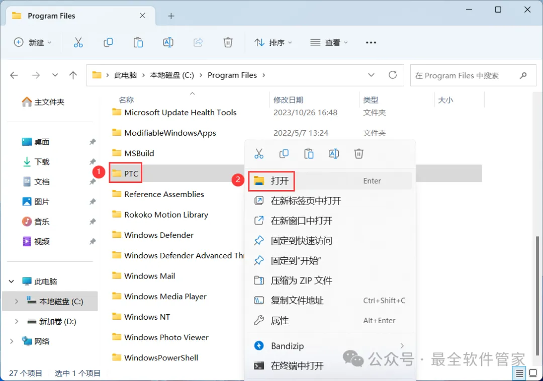6、找到【PTC】文件夹,右键【打开】它